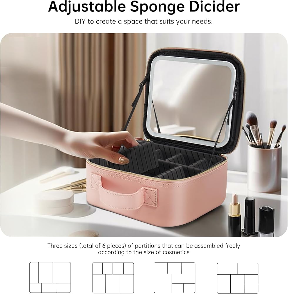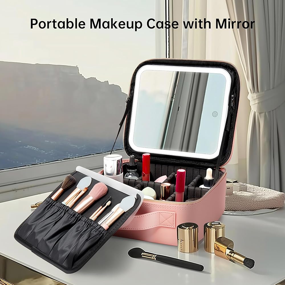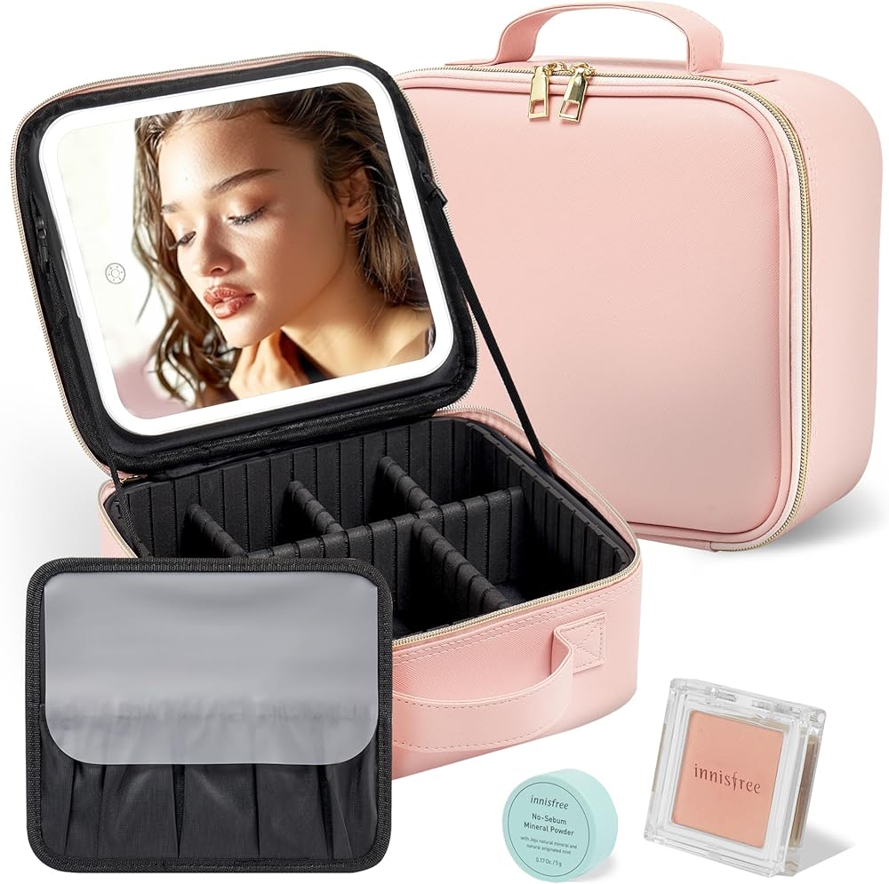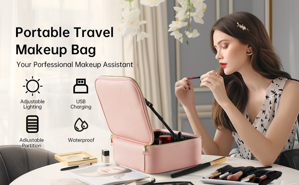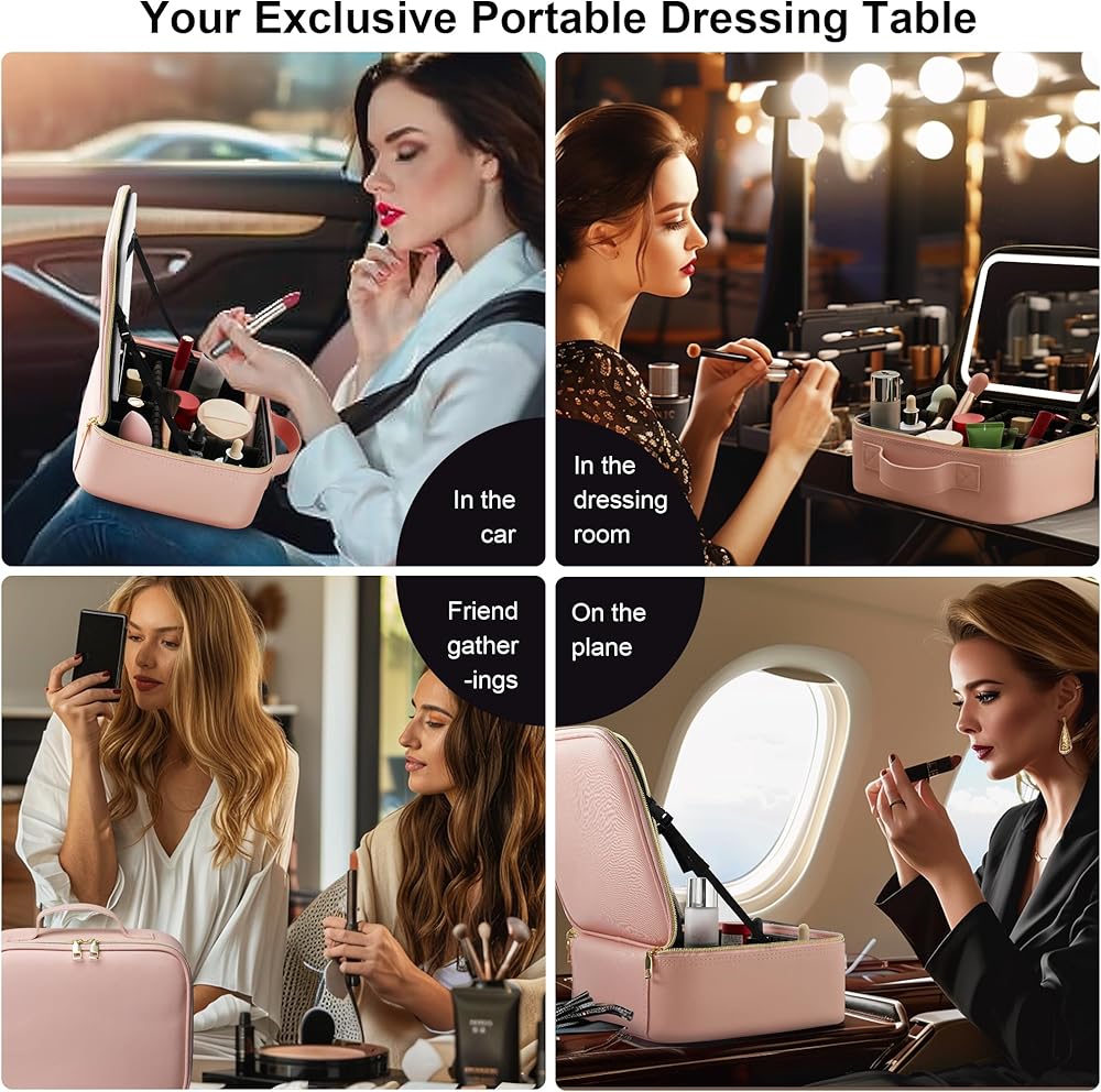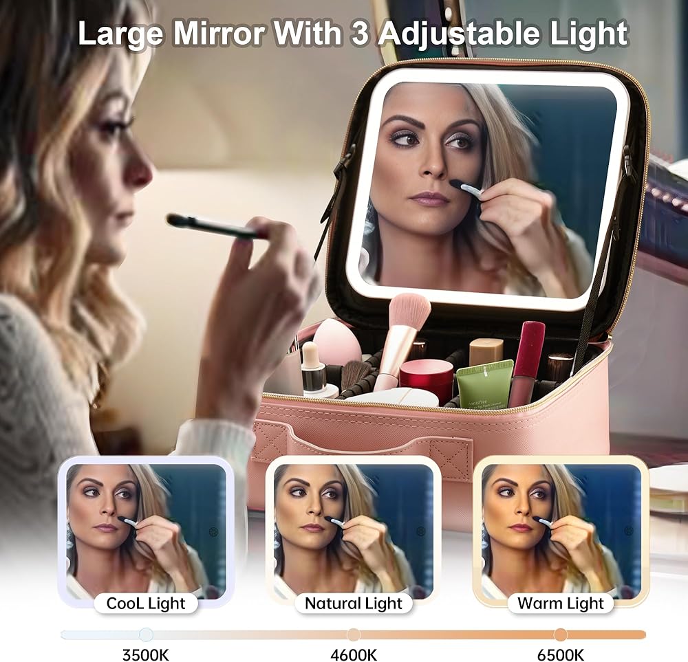 【حقيبة مكياج مع مرآة LED】قامت GAINTLUMI بترقية حقيبة المكياج التقليدية بإضافة مرآة مكياج LED على الغطاء. يوفر هذا التصميم المبتكر إضاءة مناسبة لروتين مكياجك، مما يلغي الحاجة إلى حمل مرآة منفصلة أثناء السفر. توفر مرآة LED ثلاثة ألوان إضاءة قابلة للتعديل - الأبيض والأصفر والمختلط - مع إعدادات سطوع قابلة للتخصيص، مما يضمن الإضاءة المثالية أينما ذهبت. بالإضافة إلى ذلك، بفضل وظيفتها المدمجة القابلة لإعادة الشحن، فهو مثالي لإجراء اللمسات النهائية أثناء التنقل، حتى في الأماكن التي لا يوجد بها منافذ طاقة.