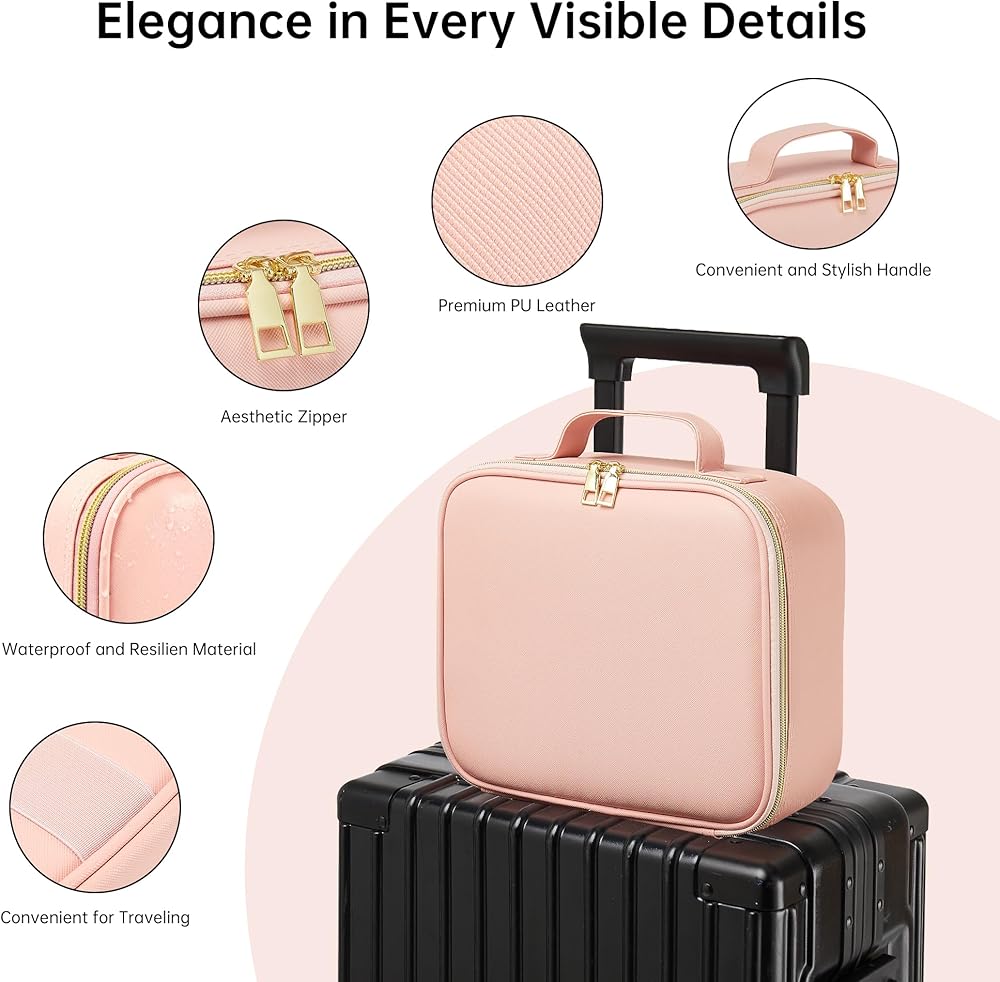 【منظم سفر محمول】تبلغ أبعاد حقيبة المكياج هذه 10.43 × 9.45 × 4.41 بوصة، وهي صغيرة الحجم ولكنها واسعة، مما يجعلها مثالية للسفر. مصنوع من مواد متينة مع لمسة نهائية من الجلد الصناعي الأنيق، وهو مقاوم للماء ومقاوم للاهتراء ومصمم ليتحمل قسوة السفر. يوفر المقبض المريح والقفل الآمن المزيد من الراحة وراحة البال، بينما تضمن المفصلات المعدنية المصنوعة من الألومنيوم متانة طويلة الأمد.