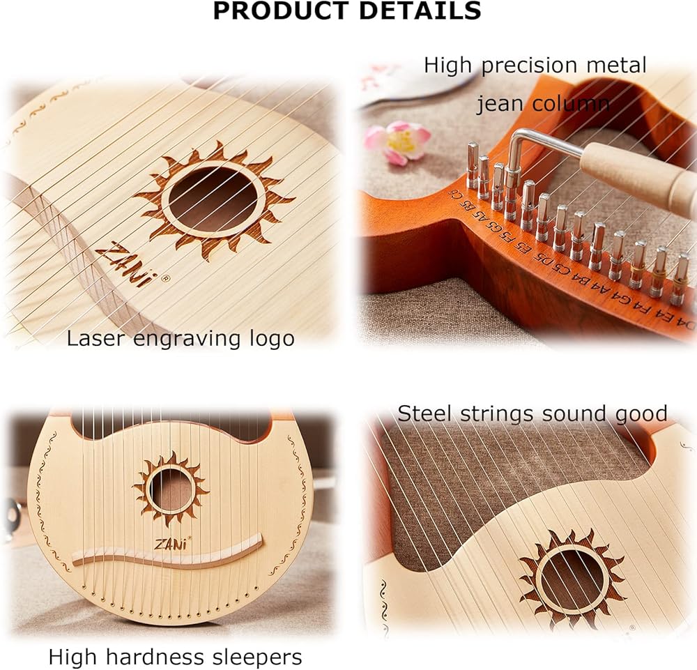 • تصميم فريد: تم نحت فتحة الصوت في نمط هيليو، القيثارة مجهزة بـ 16 خيط معدني متين. عندما تسمعها تصدر صوتًا جميلًا ومتحركًا، كما لو كانت تطير في أرض الخيال.