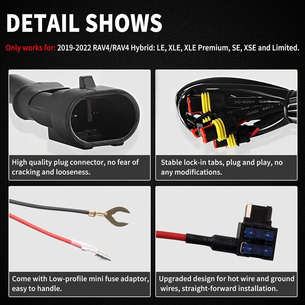 【ملاءمة مخصصة】 متوافقة مع 2019-2022 RAV4/RAV4 Hybrid: LE، XLE، XLE Premium، SE، XSE وLimited. ليس للمغامرة/TRD للطرق الوعرة/RAV4 Prime(RAV4 PHEV). تتضمن العبوة: 4 قطعة مصابيح شواء ممتازة + قطعة واحدة من مجموعة الأسلاك + قطعة واحدة من الصمامات.