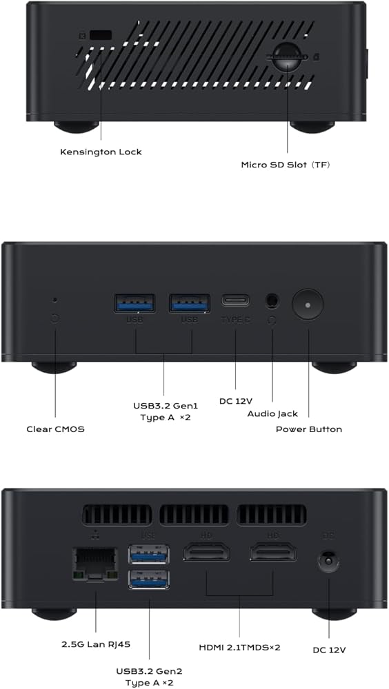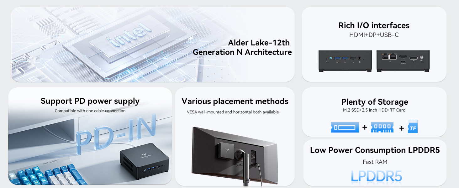 【سعة قابلة للتوسيع】يحتوي هذا الكمبيوتر الصغير على ذاكرة وصول عشوائي LPDDR5 بسعة 16 جيجابايت (بحد أقصى 4000 ميجاهرتز) و512 جيجابايت M.2 2280 SATA SSD، ويمكنك استبدال SSD حتى 2 تيرابايت. تتوفر فتحة SATA HDD مقاس 2.5 بوصة، ويمكنك تركيب محرك أقراص ثابتة سعة 2 تيرابايت (السمك في حدود 7 مم) بنفسك كما تسمح لك فتحة بطاقة TF بتوسيع المزيد من مساحة التخزين. لذلك، لا داعي للقلق بشأن نفاد مساحة التخزين ويمكنك حفظ المزيد من أفلامك المفضلة والمستندات المهمة.