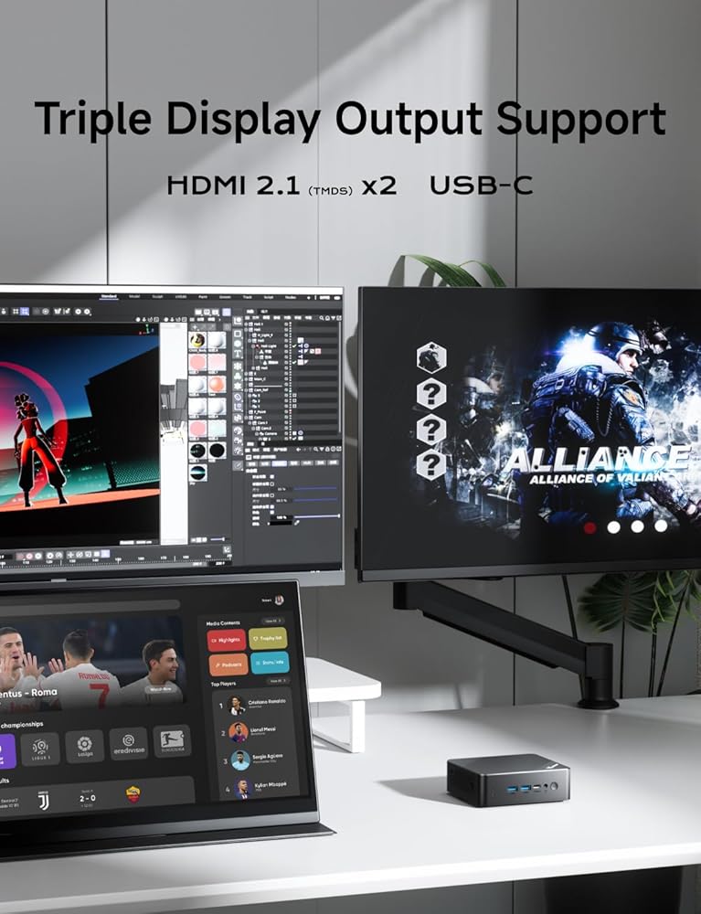 【مخرج ثلاثي 4K@60 هرتز】يأتي الكمبيوتر الصغير MINIFORUM UN100D مزودًا بمخرج فيديو 1xHDMI و1xDP و1xUSB-C 4K، ويمكنك توصيل ثلاث شاشات في نفس الوقت لتحسين كفاءة العمل أو الاستمتاع بمجموعة متنوعة من وسائل الترفيه. حامل VESA المتضمن لإعداد جهاز كمبيوتر الكل في واحد وتحرير مساحة المكتب.