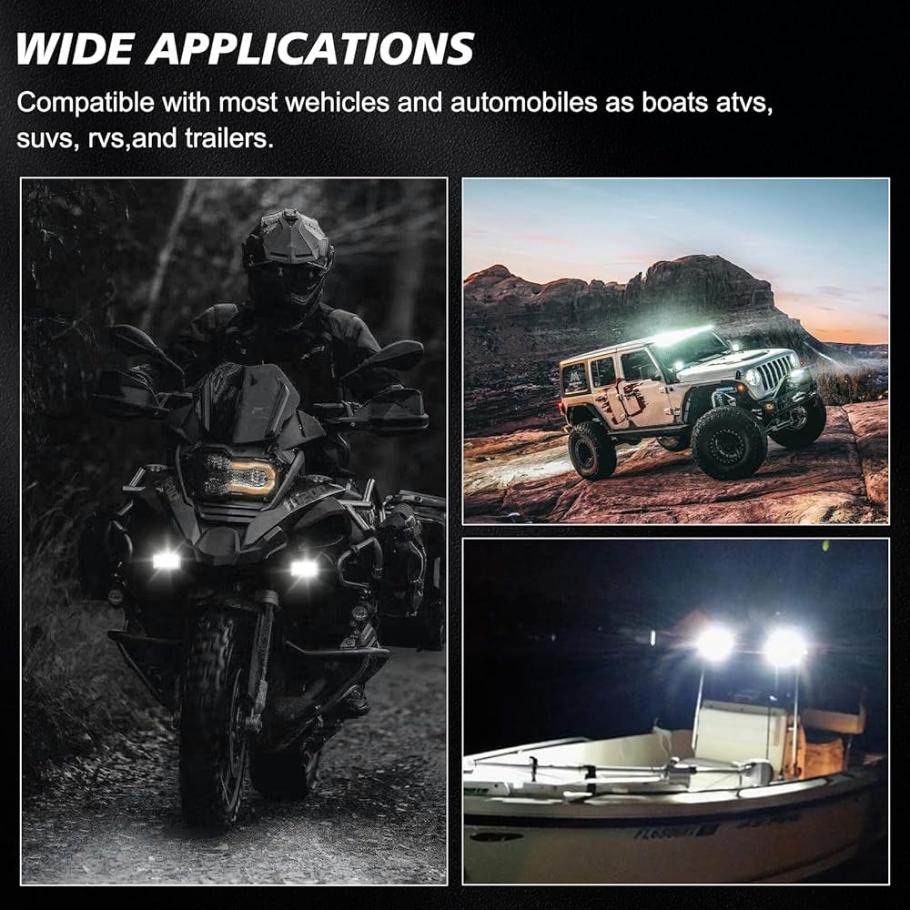 تطبيق واسع - سهل التركيب، مع جهد تشغيل 9-32 فولت تيار مستمر، متوافق مع سيارات الدفع الرباعي والشاحنات والجرار والمقطورة والسيارة والجزازة والدراجات النارية وسيارات الدفع الرباعي والمركبات الرباعية والقوارب.