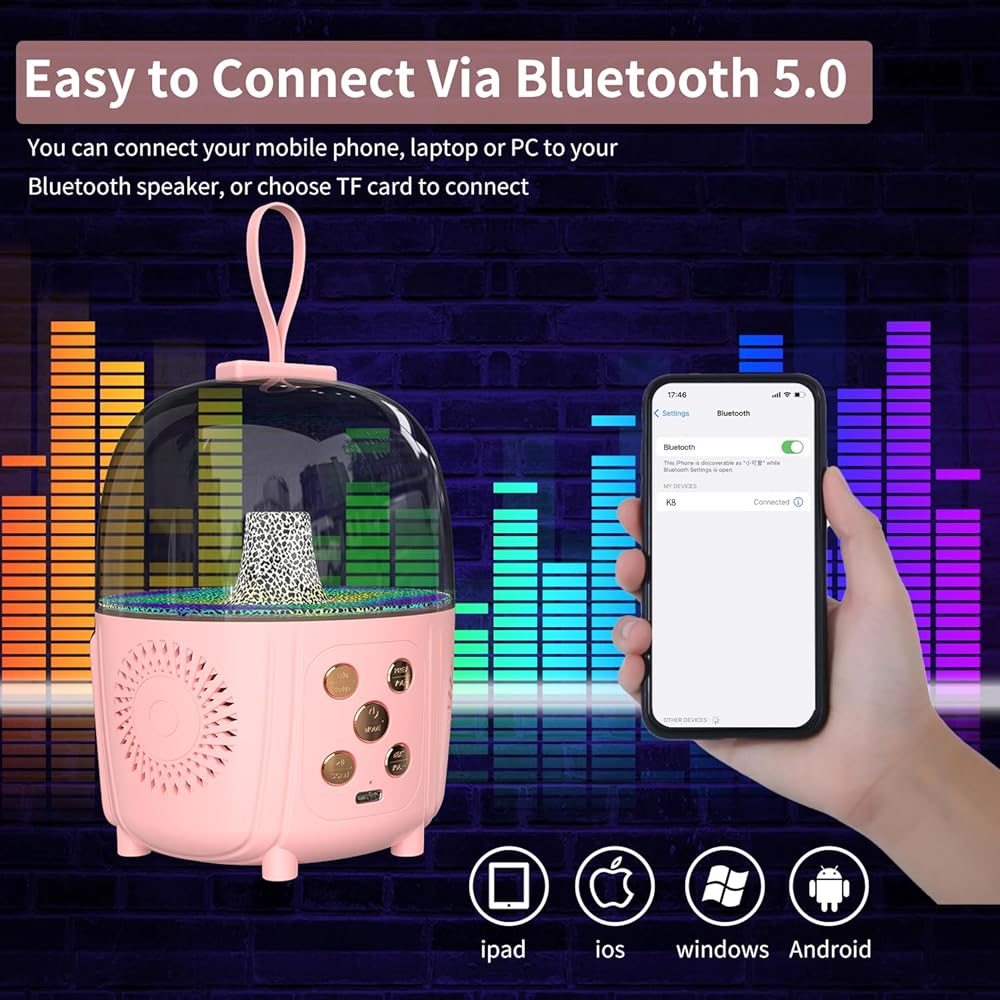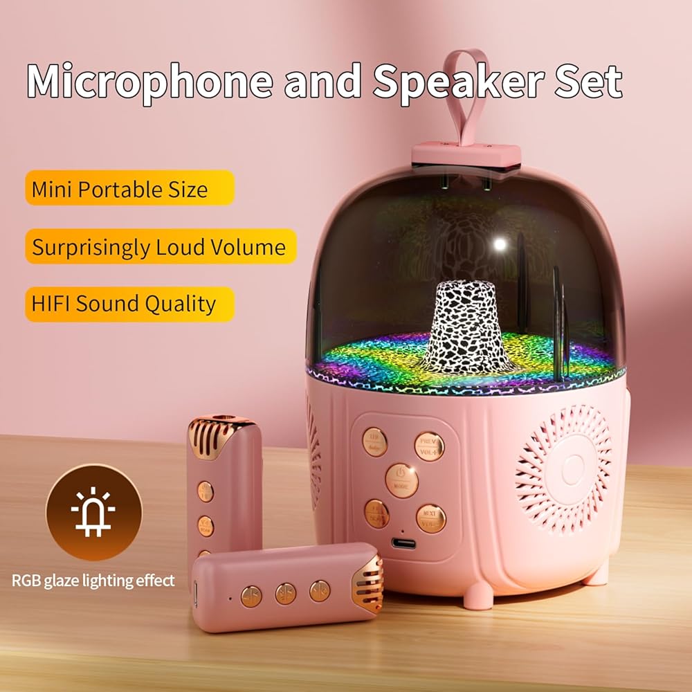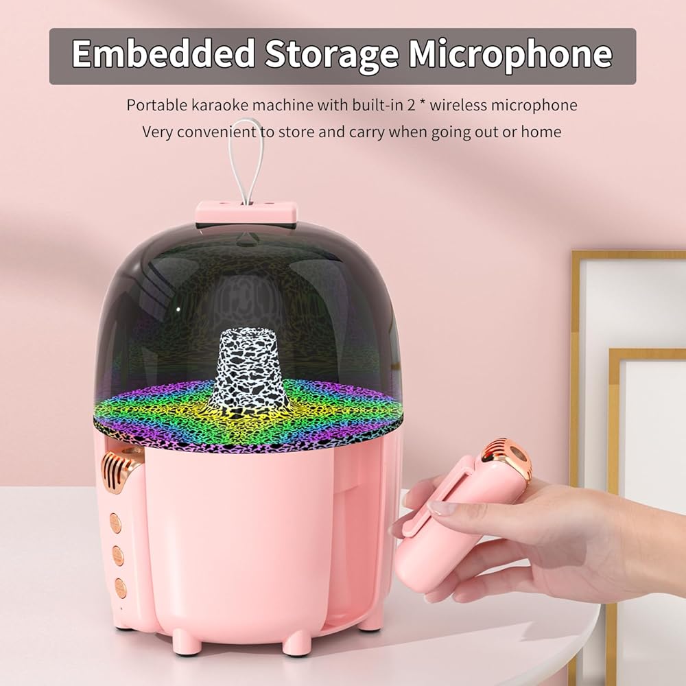 【جو الحفلة】آلة الكاريوكي للأطفال للفتيات لديها 6 أوضاع تأثيرات LED، يمكن للتبديل بزر واحد أن يخلق جوًا مرحًا ملونًا وإيقاعيًا المفضل لديك؛ هدية عيد ميلاد أو مهرجان ثمينة لطفلك أو أصدقائك أو عائلتك. (ملاحظة: إذا كان رأس الميكروفون قريبًا جدًا من مكبر الصوت، فسيكون هناك صوت حاد وغريب، وهو رد فعل صوتي شائع، لذا حاول تجنب أن يكون رأس الميكروفون قريبًا جدًا من مكبر الصوت.)