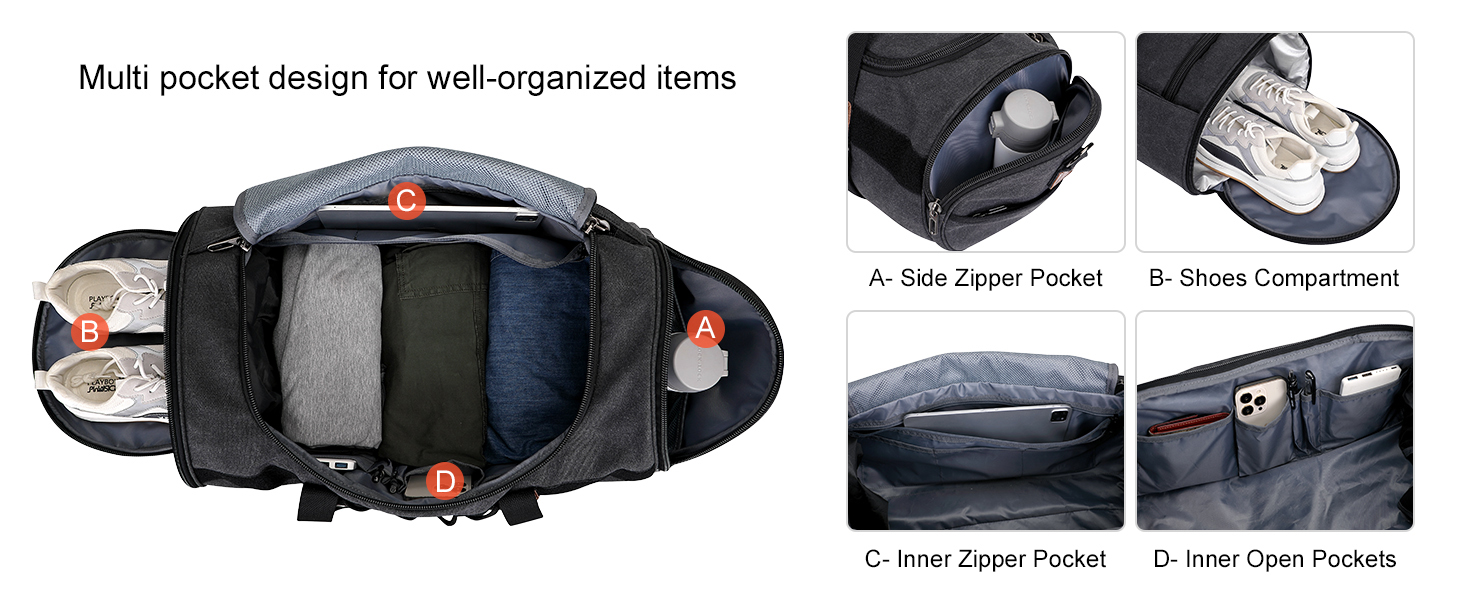 مع حجرة الأحذية: تأتي حقيبة اليد هذه مع حجرة منفصلة للأحذية، والتي يمكن أن تفصل حذائك عن الملابس النظيفة. حجرة الأحذية بالداخل مصنوعة من نسيج بوليستر عالي الجودة مقاوم للماء. ومجهزة بفتحات مسامية.