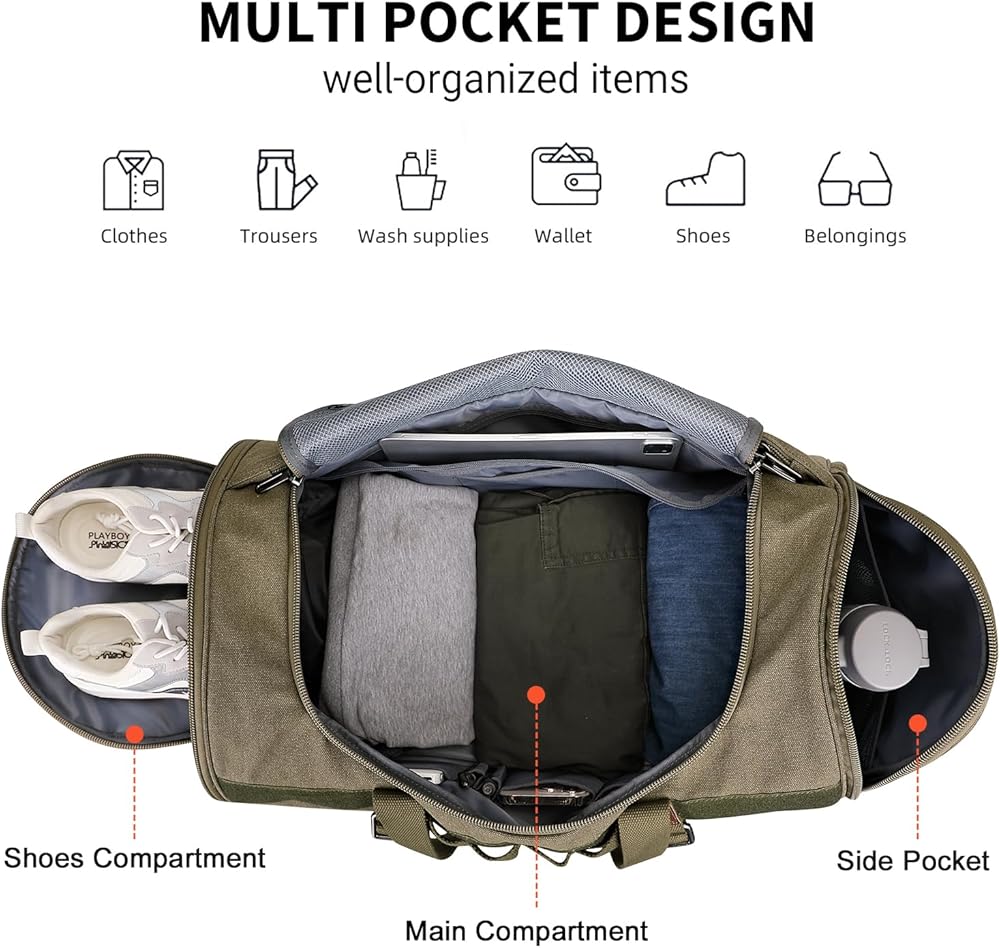 سعة كبيرة: يمكن لحقائب الدفل هذه العناصر الأساسية لرحلة مدتها 3-4 أيام. يمكن أن تحمل الملابس والأحذية وأدوات النظافة و. تحتوي حقيبة السفر على خمس حجرات، وحجرة رئيسية كبيرة، وجيبين جانبيين بسحاب، وجيب خلفي بسحاب. توجد حقيبة شبكية كبيرة بسحاب في الحجرة الرئيسية. تحافظ الجيوب الصغيرة المتنوعة داخل الحجرة على أغراضك مرتبة ومنظمة. مناسبة للاستخدام كحقائب عطلة نهاية الأسبوع، وحقائب ليلية، وحقائب سفر لمسافات قصيرة.