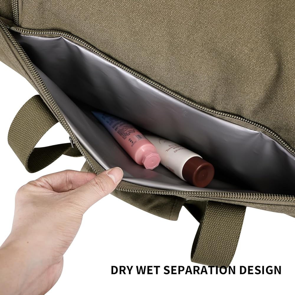 تصميم فصل جاف ورطب: الجيب المزود بسحاب الموجود في الجزء الخلفي من حقيبة السفر مصنوع من مادة PVC المقاومة للماء، مما يجعل من السهل تصنيف وتخزين أغراضك. يمكن وضع المناشف والملابس المبللة وأدوات النظافة لتجنب التبلل بالأشياء الجافة الأخرى.
