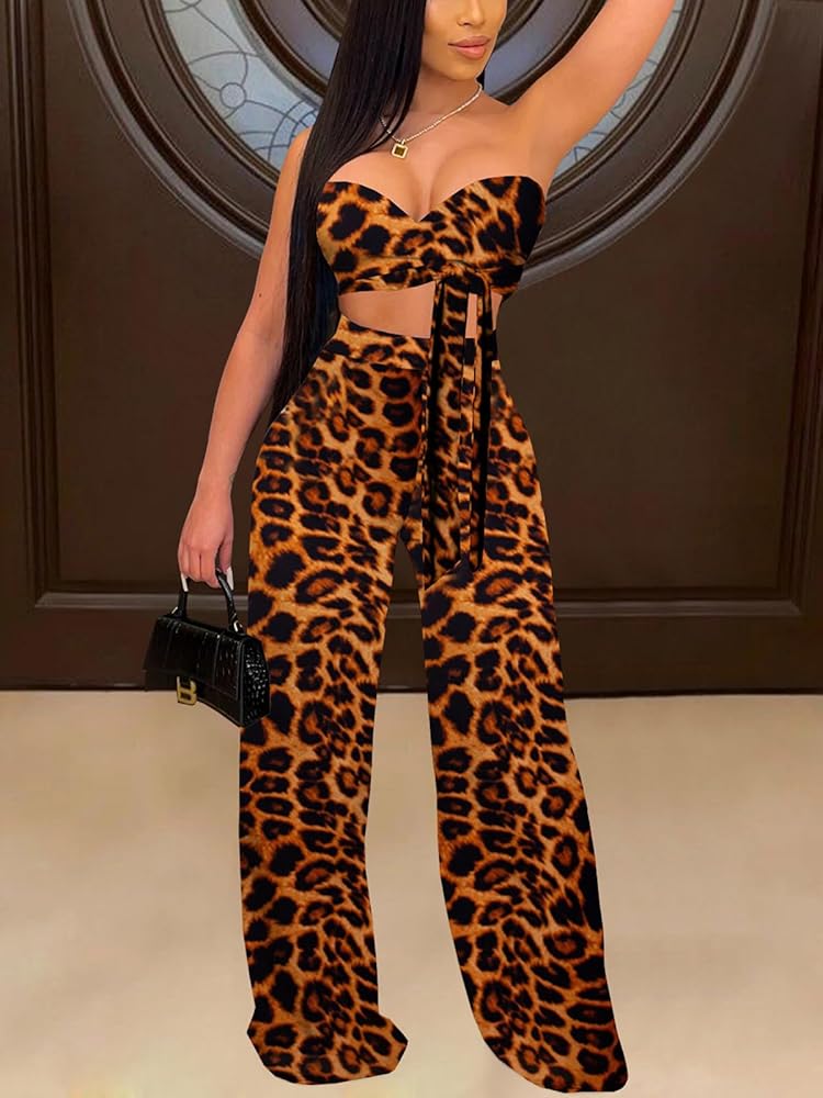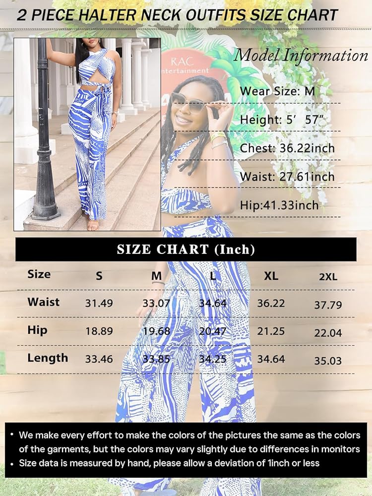 السمات: ملابس صيفية مكونة من قطعتين، بلوزة متعددة الارتداء، رقبة على شكل رسن، بدون أكمام، عقدة أمامية، مفتوحة من الأمام، بدون ظهر، مطبوعة، سراويل بالازو، سراويل واسعة، سراويل طويلة، ملابس سراويل من قطعتين لملابس العطلات النسائية.
