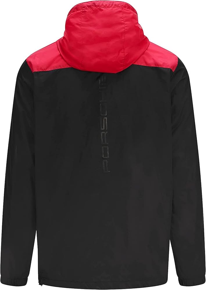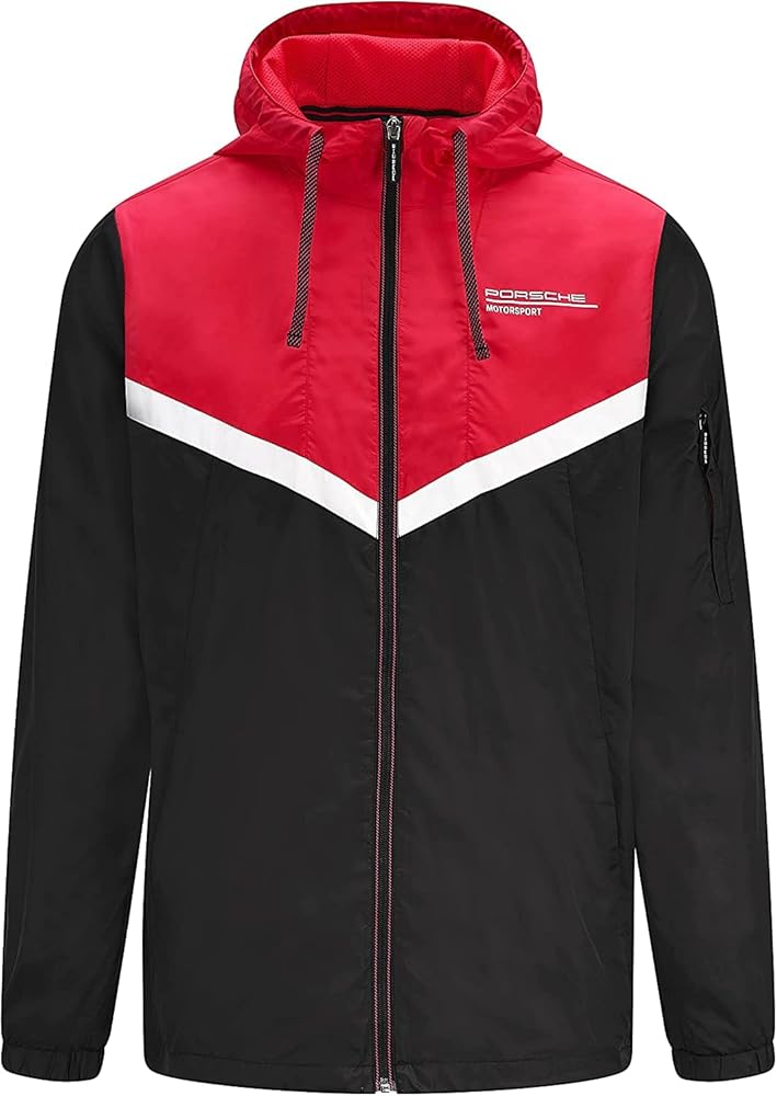 New to the Porsche Motorsports collection. Beat the elements in the 2021 logo windbreaker jacket designed with 'cut and sew' chevron insert on the chest. Also features an elastic cuff and bungee cord at the hem for that comfy fit. Official licensed item. Part of the Porsche Motorsports Collection, as seen worn by the Porsche works team during the FIA World Endurance Championship