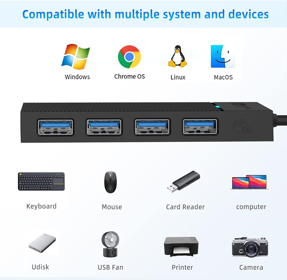 【تطبيق واسع】يتوافق محول USB متعدد المنافذ هذا مع أجهزة USB 2.0 وUSB 1.1. متوافق مع أجهزة ومنافذ USB 3.1/3.2 بسرعات 3.0. محور USB للكمبيوتر المحمول. بدون برامج تشغيل متوافق مع أنظمة التشغيل Windows وMac OS 10.X والإصدارات الأحدث وLinux وAndroid وأنظمة أخرى.