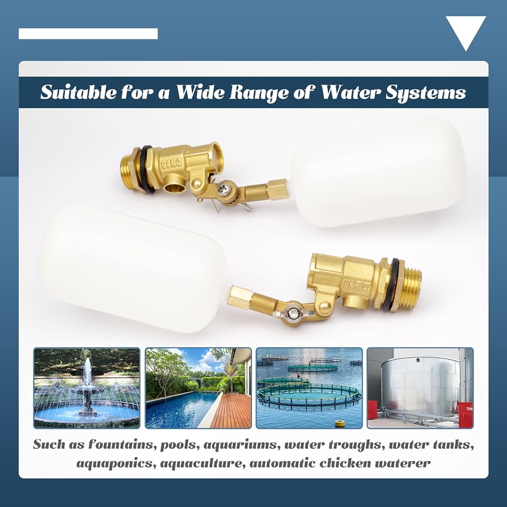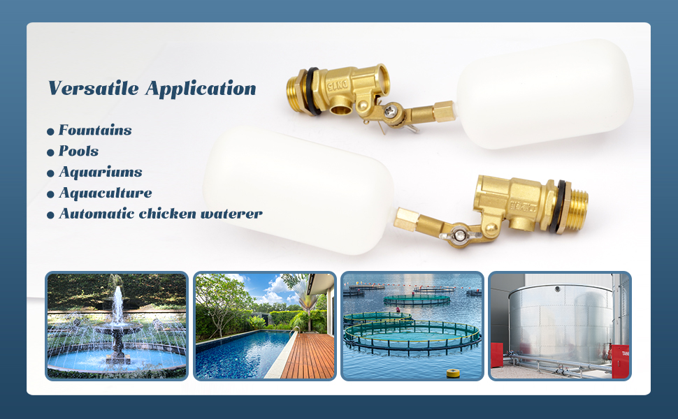 • تطبيق متعدد الاستخدامات: مناسب لمجموعة واسعة من أنظمة المياه، هذا الصمام العائم مثالي للاستخدام في النوافير وحمامات السباحة وأحواض السمك وأحواض المياه وخزانات المياه والأكوابونيك وتربية الأحياء المائية ومسقي الدجاج الأوتوماتيكي والبرك، مما يوفر حلاً متعدد الاستخدامات للحفاظ على مستويات المياه. في إعدادات مختلفة.
