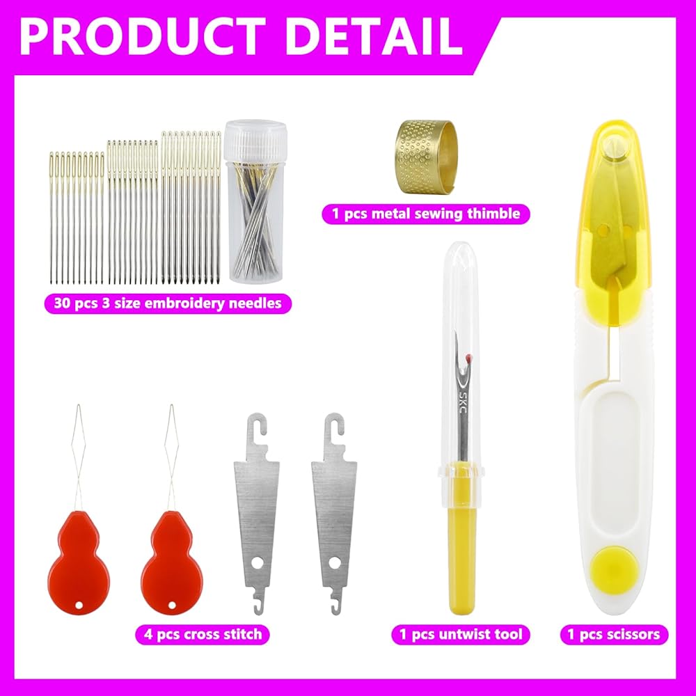 • [Great Value Package You Will Get]: 3 layers of transparent boxes, include 150pcs cross stitch thread, 30pcs thread needles, 1 thread remover, 4 threaders in 2 models , 1 thimble, 1 thread scissors. Basic embroidery set meets daily needs. Each individual floss is 8.7 yard (8 meter) skein.
