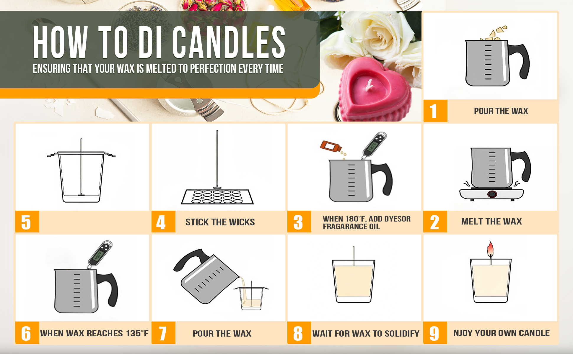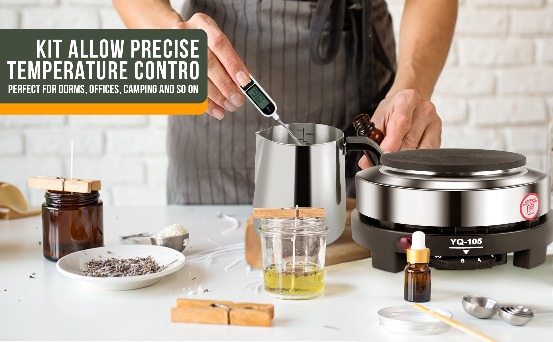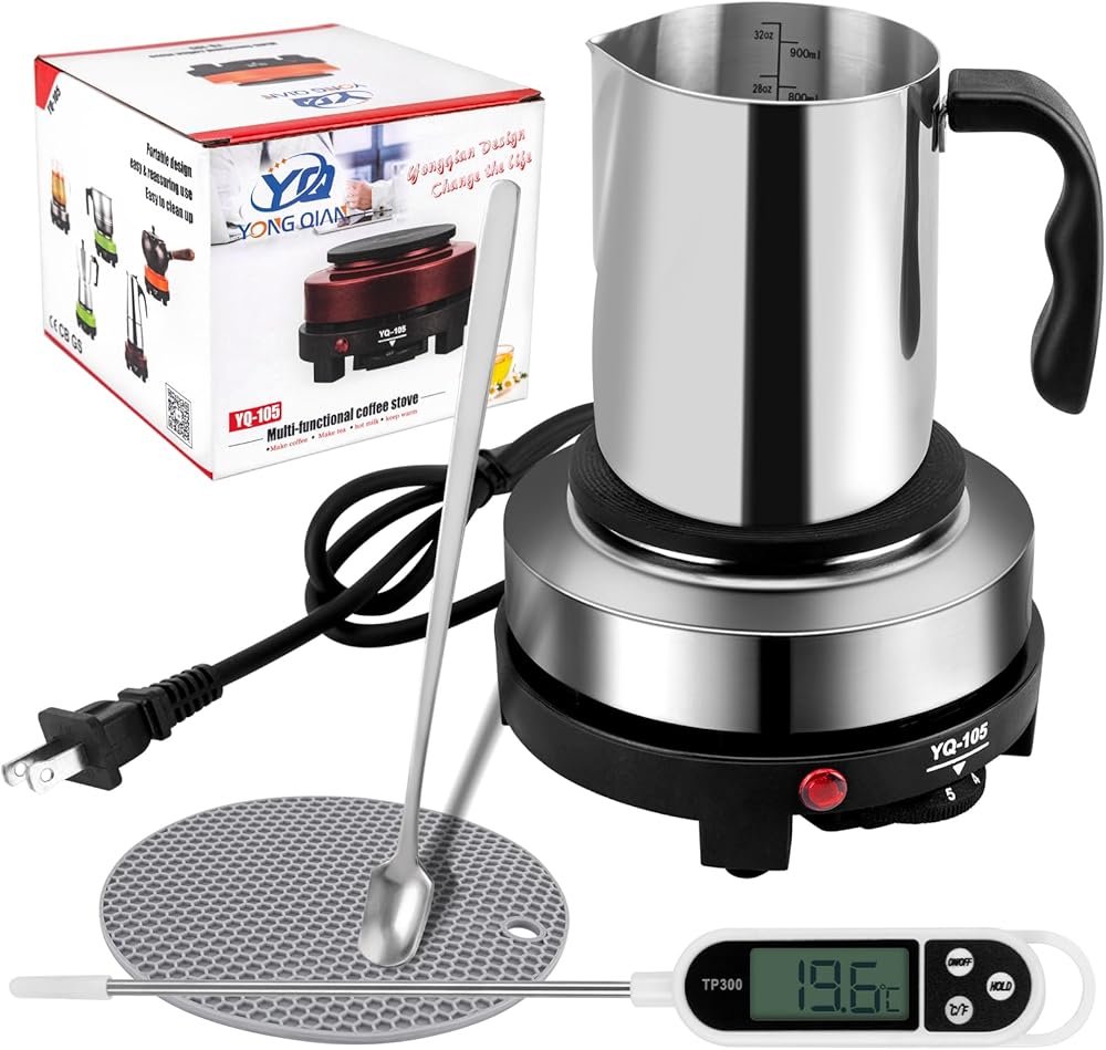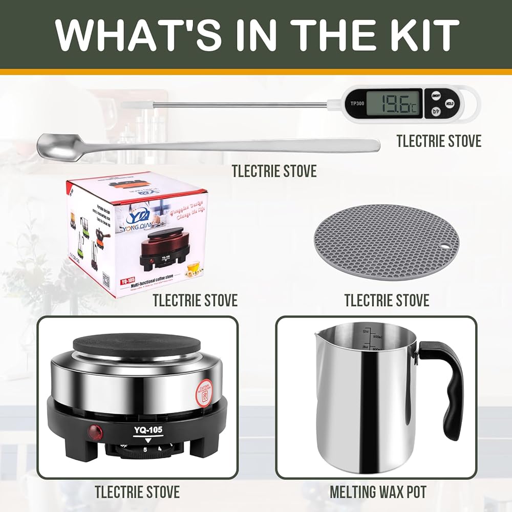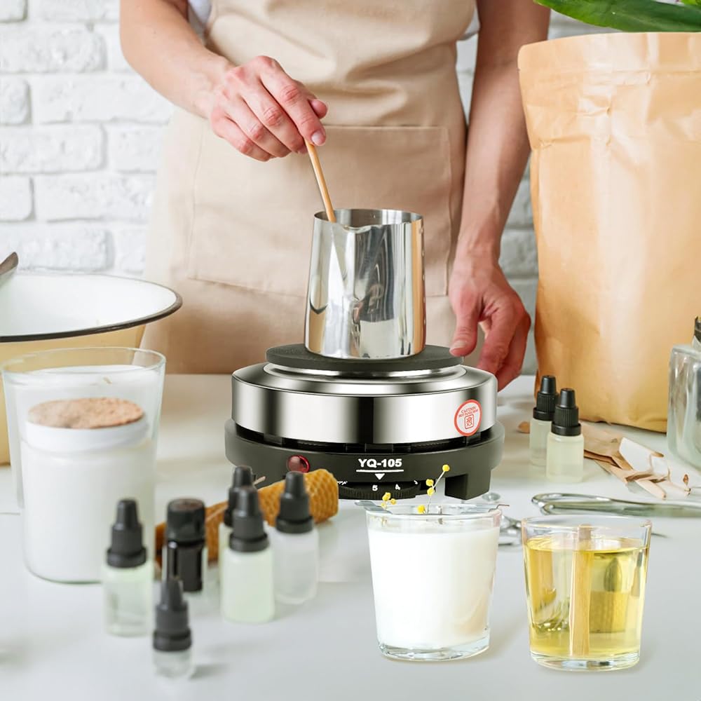 【مجموعة صنع الشموع】تتضمن مجموعة صنع الشموع الكاملة وعاء ذوبان الشموع 1 × 900 مل، و1 × طبق ساخن 500 وات (أسود)، و1 × ملعقة تحريك، و1 × مقياس حرارة، و1 × وسادات مضادة للحرق، و1 × دليل مستخدم.