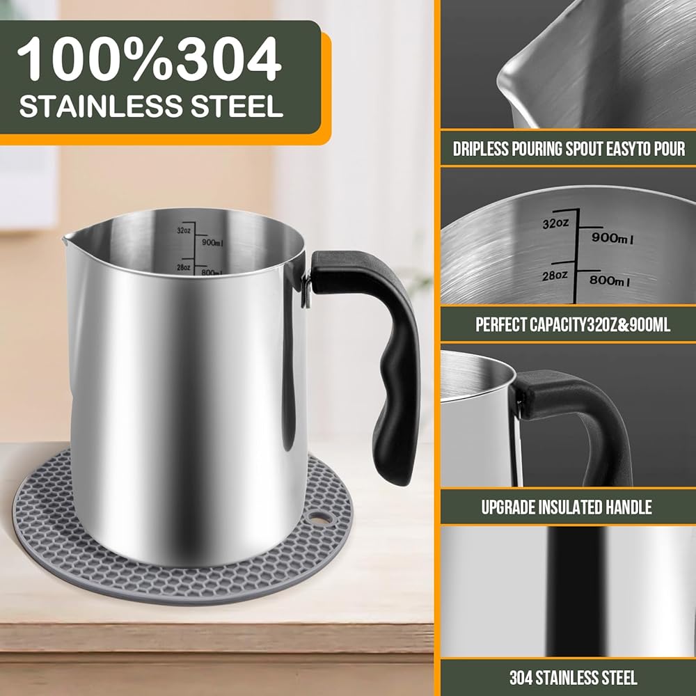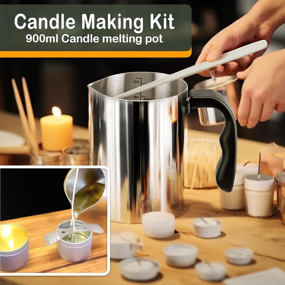 【مستلزمات صنع الشموع الآمنة والمتينة】تم تصميم مجموعة وعاء صنع الشموع لحمل 32 أونصة/900 مل من الشمع المنصهر ومصنوعة من الفولاذ المقاوم للصدأ 304 عالي الجودة، لوازم صنع الشموع هذه مع طقم اللوحة الساخنة ليست متينة فحسب ولكنها آمنة أيضًا للذوبان. الشمع. إنه هيكل قوي وأداء موثوق يجعله إضافة طويلة الأمد إلى لوازم صنع الشموع الخاصة بك.