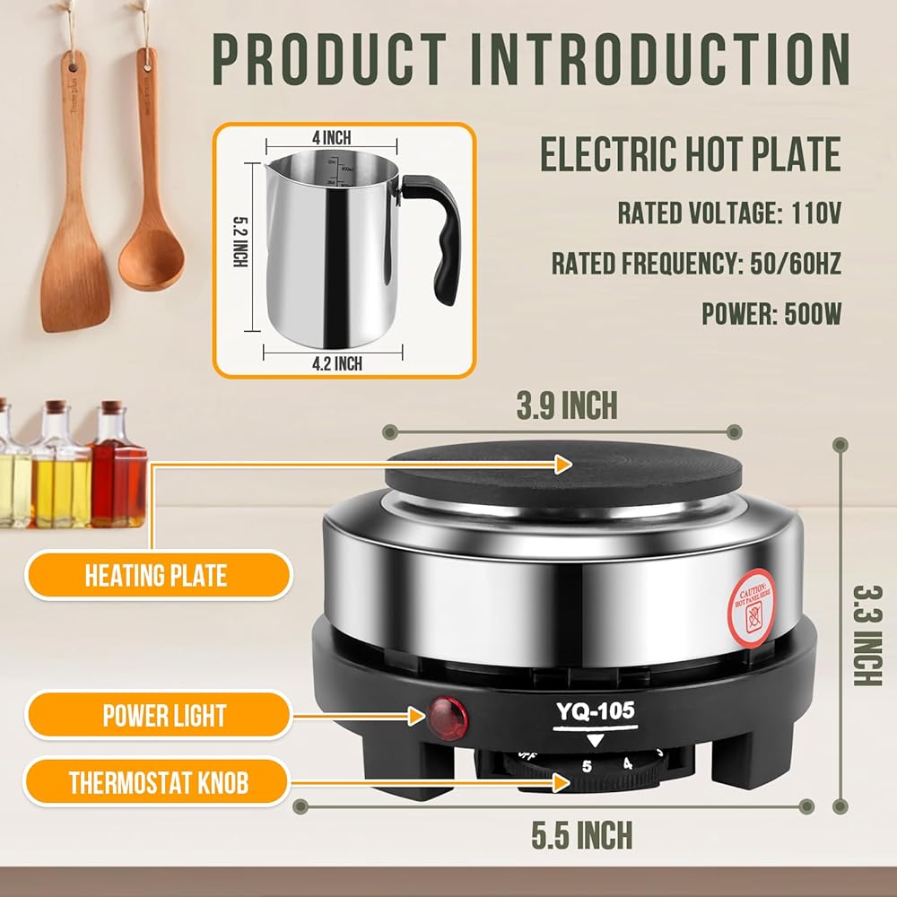 【لوحة تسخين بـ 5 تروس】تأتي مجموعة وعاء ذوبان الشمع هذه مع طبق ساخن مع 1-5 تروس، كل منها بقيمة ضبط درجة الحرارة. هناك حاجة إلى 2-3 درجات حرارة فقط لإذابة الشموع. لوحة التسخين الكهربائية تدعم فقط الجهد الكهربائي القياسي الأمريكي 110 فولت. فهو يسمح لك بإذابة الشمع لصنع الشموع، وكذلك لصنع القهوة والشاي وحتى أحمر الشفاه.