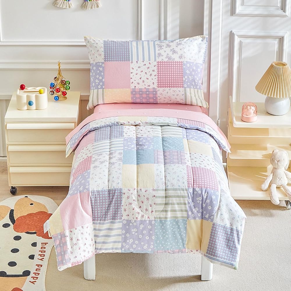 • ما تحصل عليه: طقم فراش للأطفال مكون من 4 قطع يشتمل على: 1 لحاف ذو وجهين (42 بوصة × 57 بوصة)، 1 كيس وسادة ذو وجهين (20 بوصة × 30 بوصة)، 1 ملاءة علوية مسطحة (45 بوصة × 60 بوصة) و1 ملاءة سفلية مثبتة (28 بوصة × 52 بوصة × 8 بوصة). تم قياس جميع القطع لتناسب سرير الأطفال الصغار ذو الحجم القياسي.