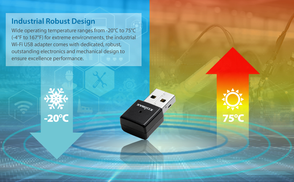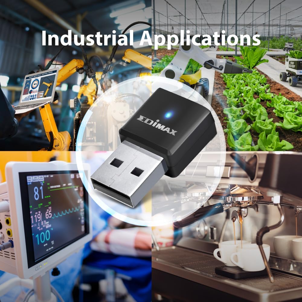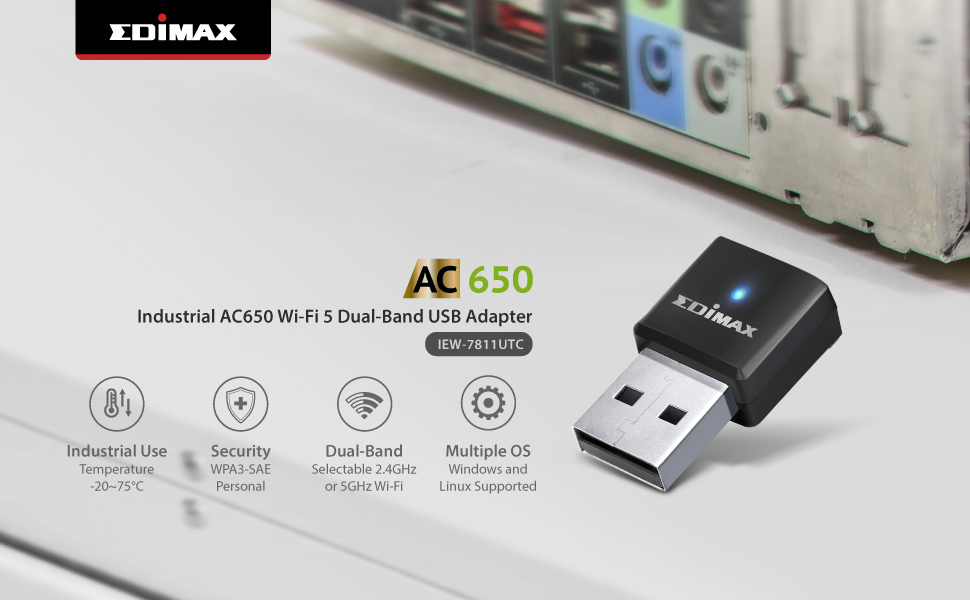 EDiMAX Wi-Fi 5 802.11ac محول USB للشبكات اللاسلكية ثنائي النطاق من الدرجة الصناعية AC650 لأجهزة الكمبيوتر والأنظمة المدمجة، Windows، Linux، تحمل درجات الحرارة القصوى -4F إلى 167F، IEW-7811UTC