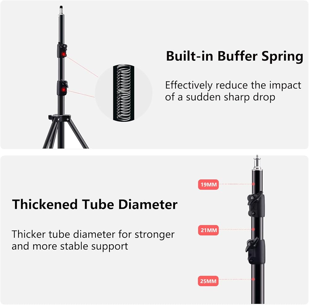 【زنبرك عازل مدمج】حامل إضاءة من سبائك الألومنيوم مع وسادة زنبركية مدمجة يمكن أن يقلل من تأثير الهبوط السريع أثناء تعديل الارتفاع، مما يحمي معدات التصوير الفوتوغرافي الخاصة بك بشكل فعال.