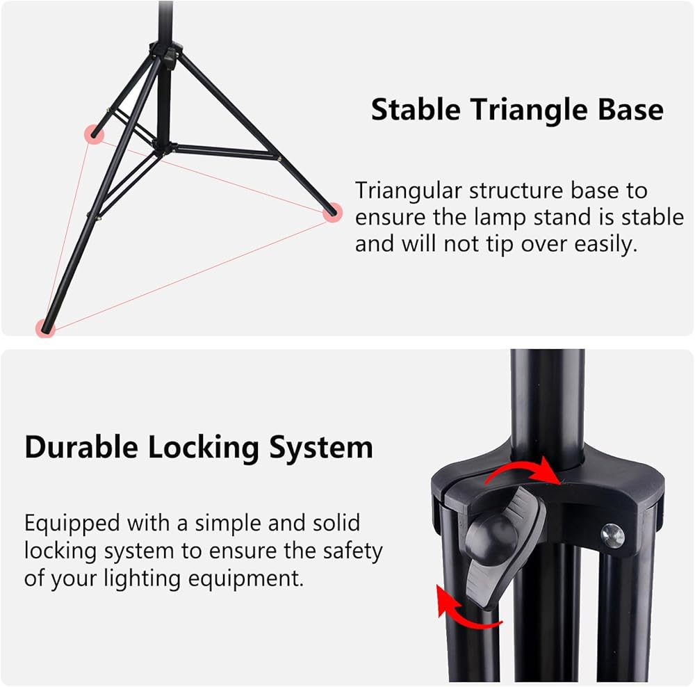 【مستقر ومشدود】يعتمد حامل الإضاءة عالي التحمل على هيكل مثلث مما يجعله أكثر استقرارًا وقوة لدعم معظم معدات التصوير الفوتوغرافي. يمكن قفله بسهولة بعد ضبط الارتفاع بمقبض قفل صلب، ليس من السهل أن يسقط.
