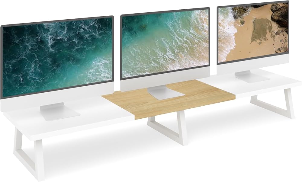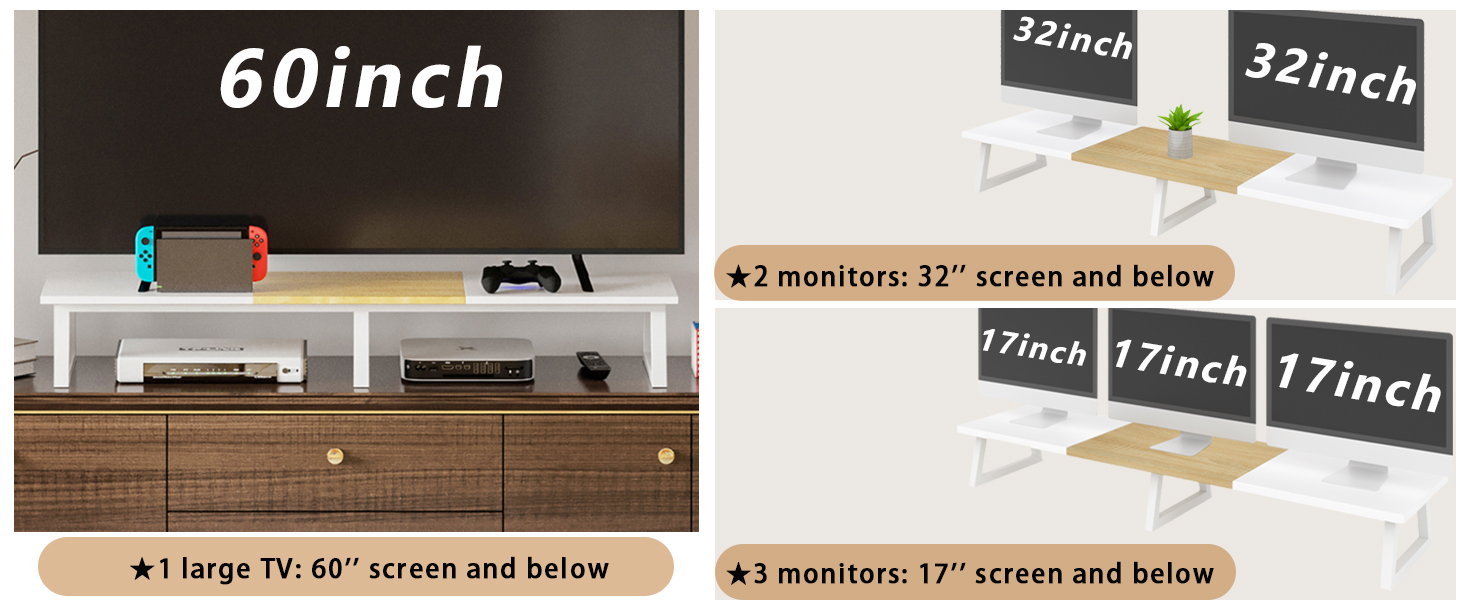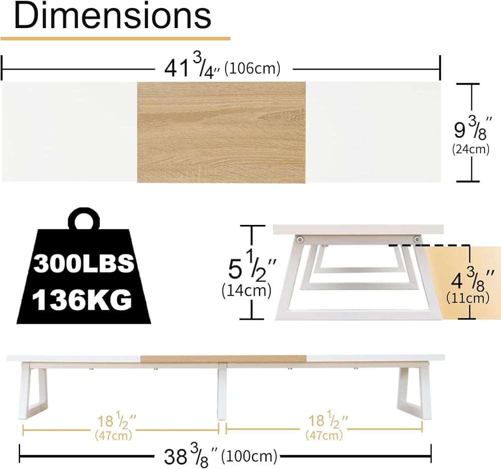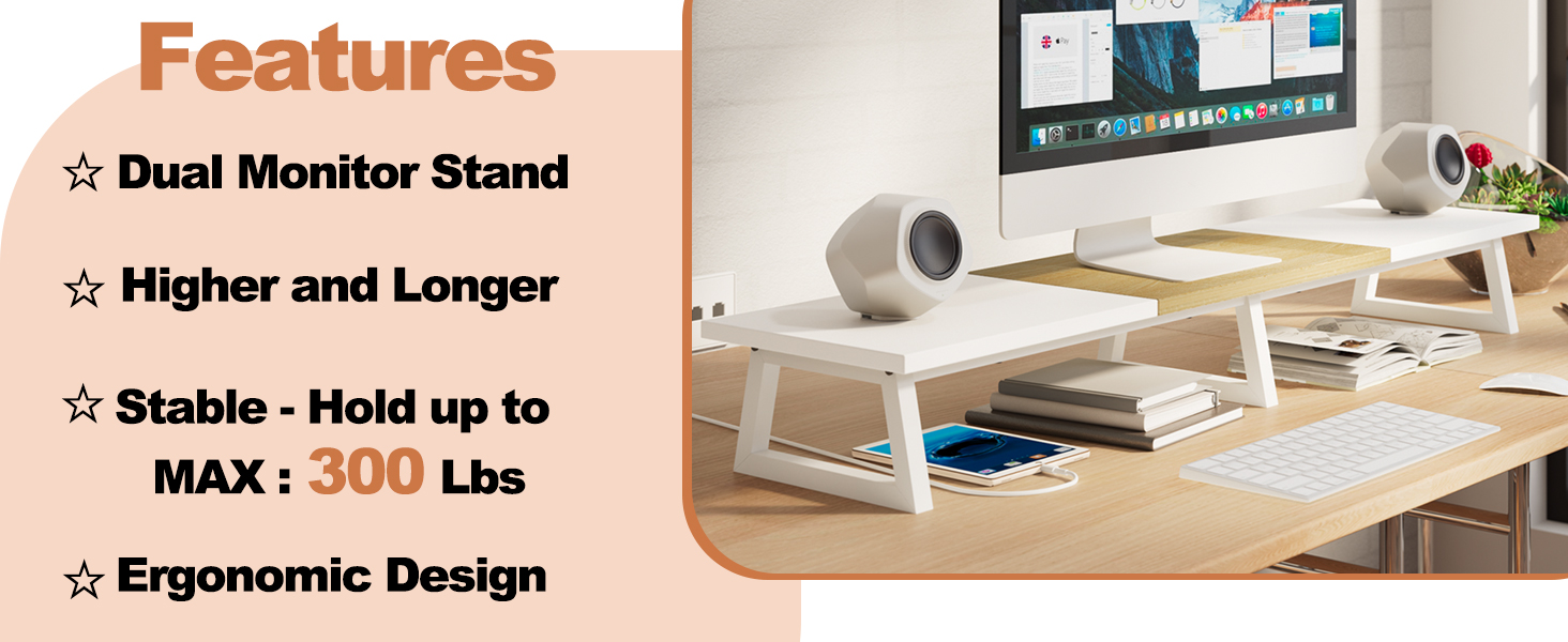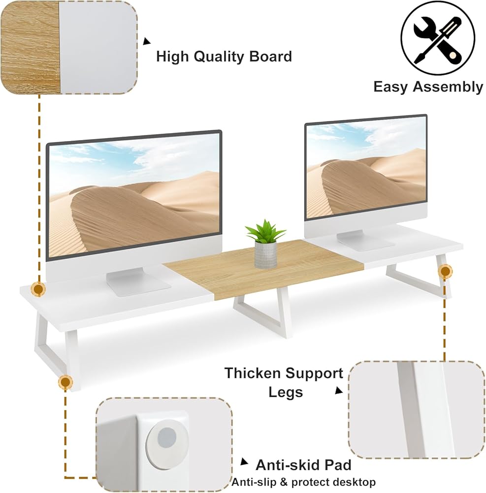 هيكل متين: هيكل من الخشب المقوى بالفولاذ يدعم ما يصل إلى 300 رطل، مما يحافظ على الشاشات في مكانها بشكل آمن على مكتبك دون التعرض لخطر التذبذب أو الانهيار.