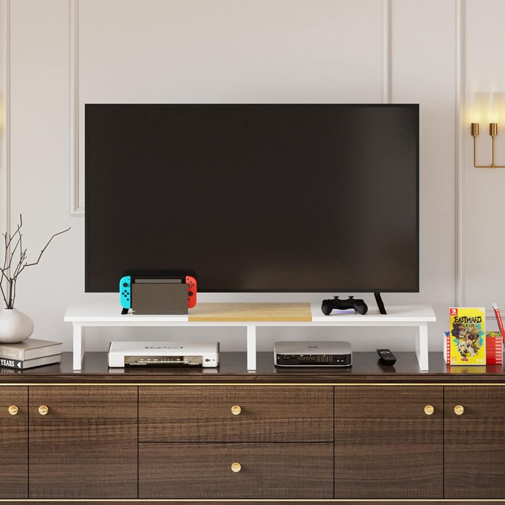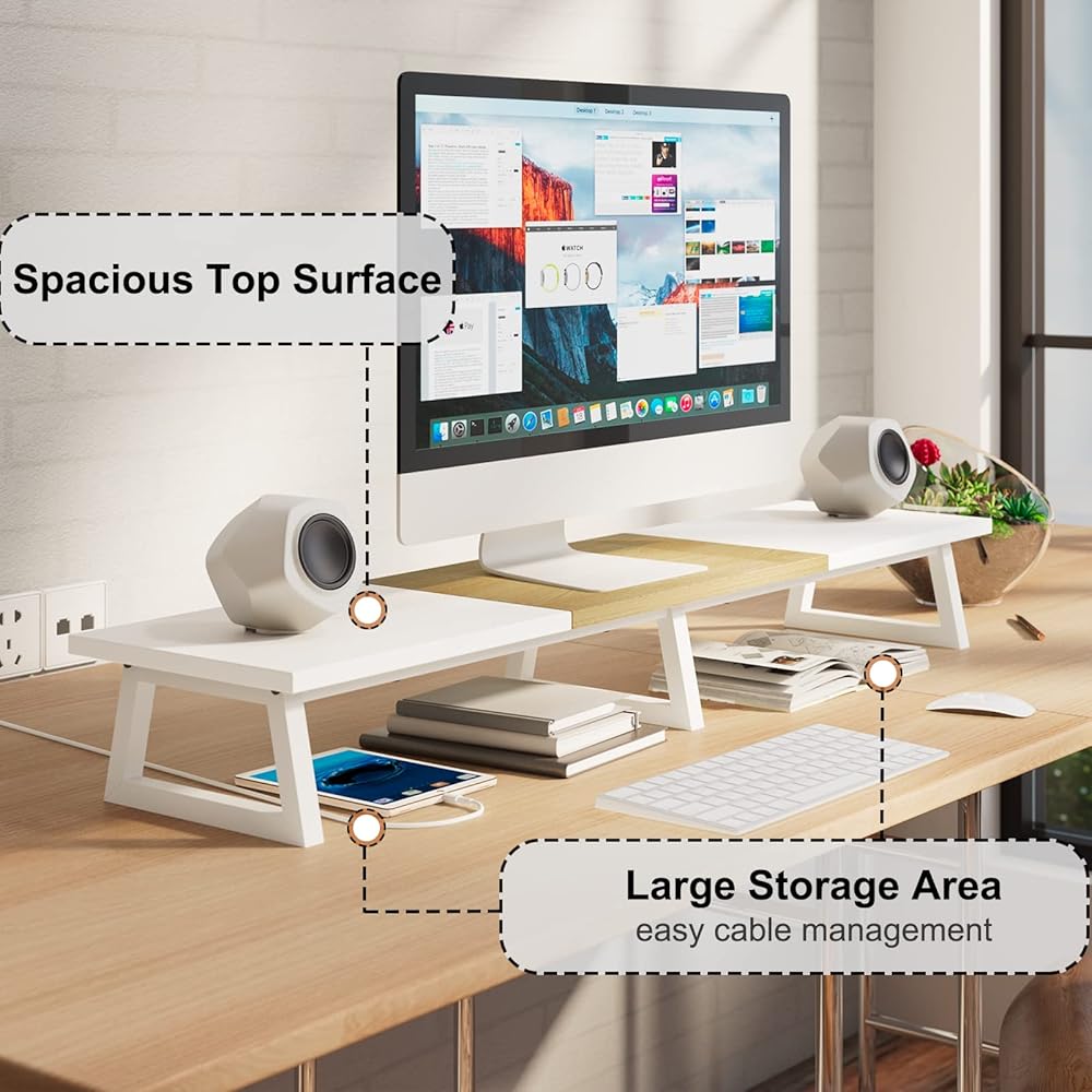 تخزين متعدد الاستخدامات: يتضمن تصميم الرف المفتوح مساحة سطح إضافية أسفل الشاشات لتخزين لوحات المفاتيح أو وحدات المعالجة المركزية أو الكابلات أو ملحقات سطح المكتب الأخرى بطريقة منظمة.
