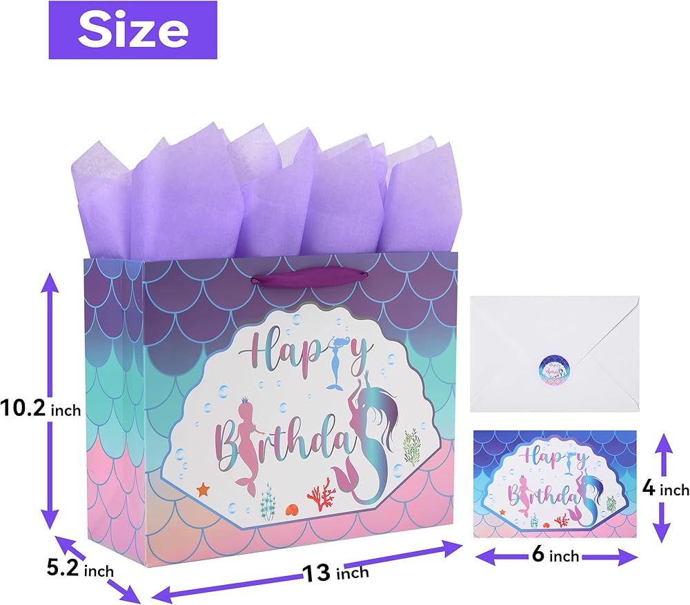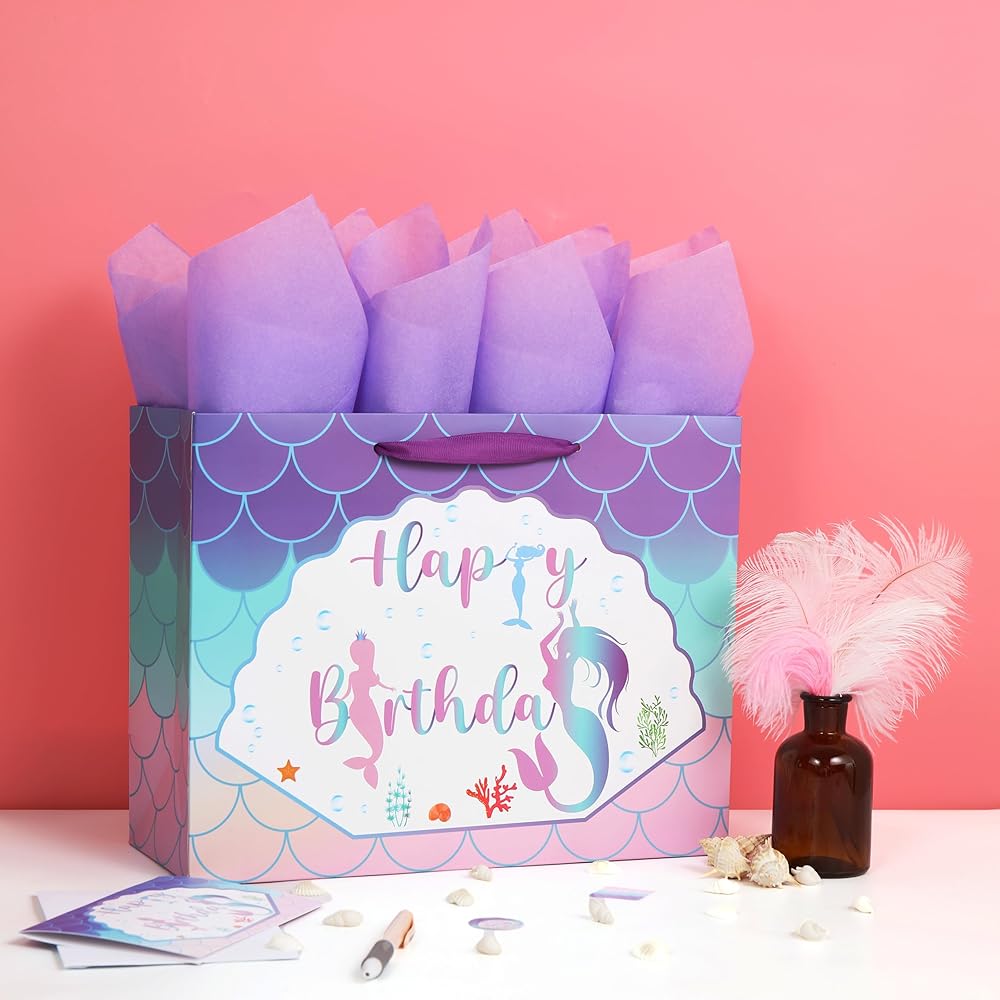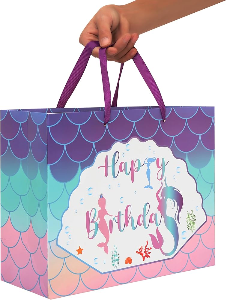تصميم مميز: تثير حقيبة الهدايا الرائعة هذه إحساسًا آسرًا بالجمال تحت الماء، مما يخلق أجواء سحرية. الألوان النابضة بالحياة، جنبًا إلى جنب مع صورة ظلية لحورية البحر، تنسج بشكل معقد عبارة "عيد ميلاد سعيد"، مما يجعلها عرضًا مبهجًا لا يُنسى للاحتفال بعيد ميلاد.