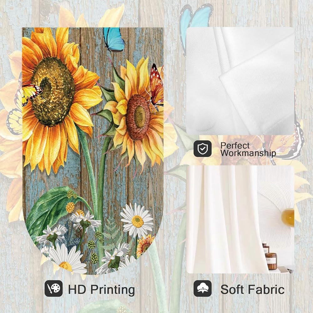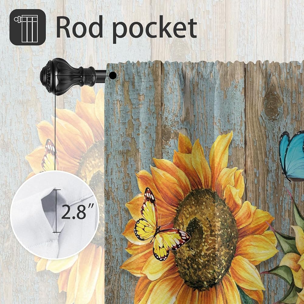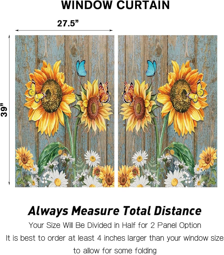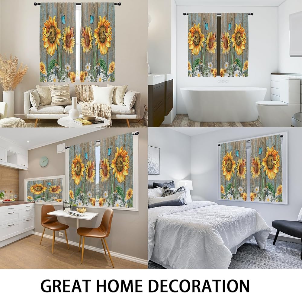 Coxila عباد الشمس ستائر نافذة المطبخ 27.5 × 39 بوصة صغيرة قصيرة صغيرة مقهى قضيب جيب ريفي أبيض ديزي الأزهار فراشة غرفة المعيشة غرفة نوم العلاج المنزلي مجموعة من 2 لوحات الستار الستائر الطبقات