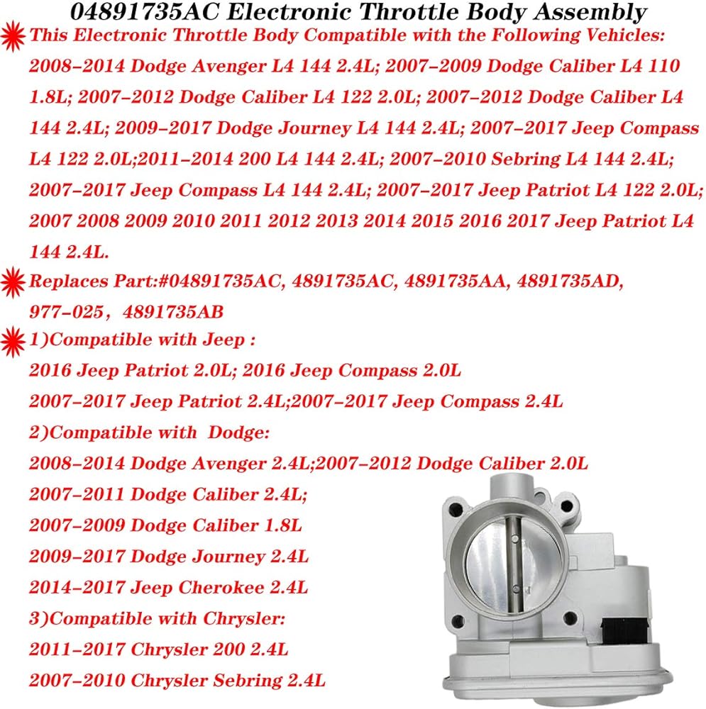 ◆Replaces Part:#04891735AC, 4891735AC, 4891735AA, 4891735AD, 977-025,4891735AB. Electronic Throttle Body Also known as: electronic throttle body assembly, throttle body assembly, trotle body, electronic throttle body regulates