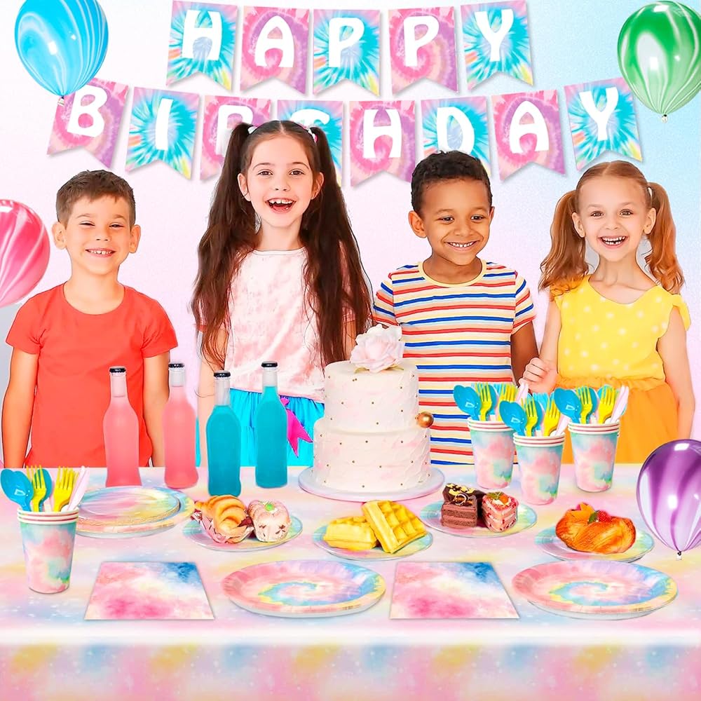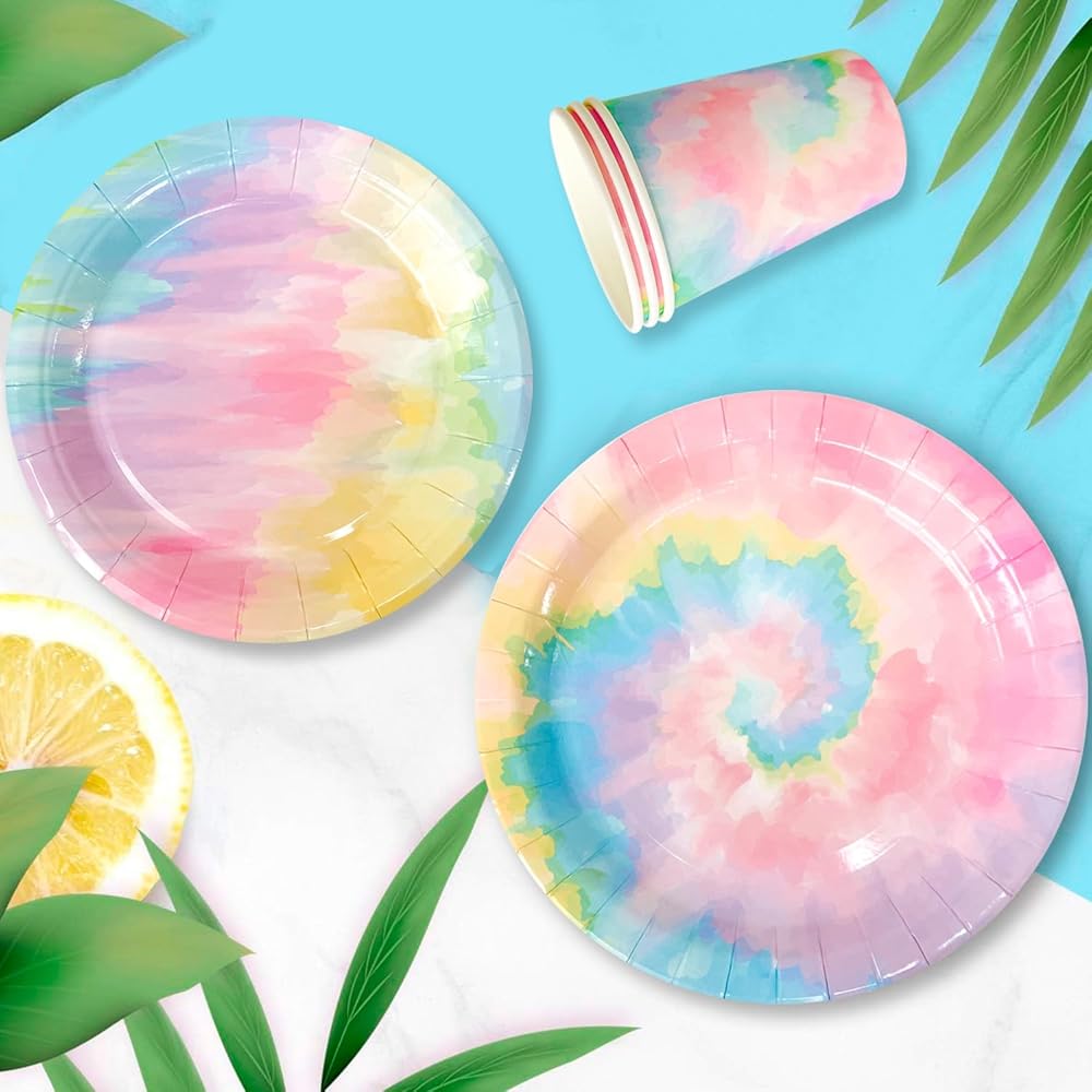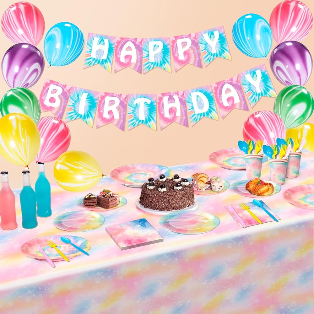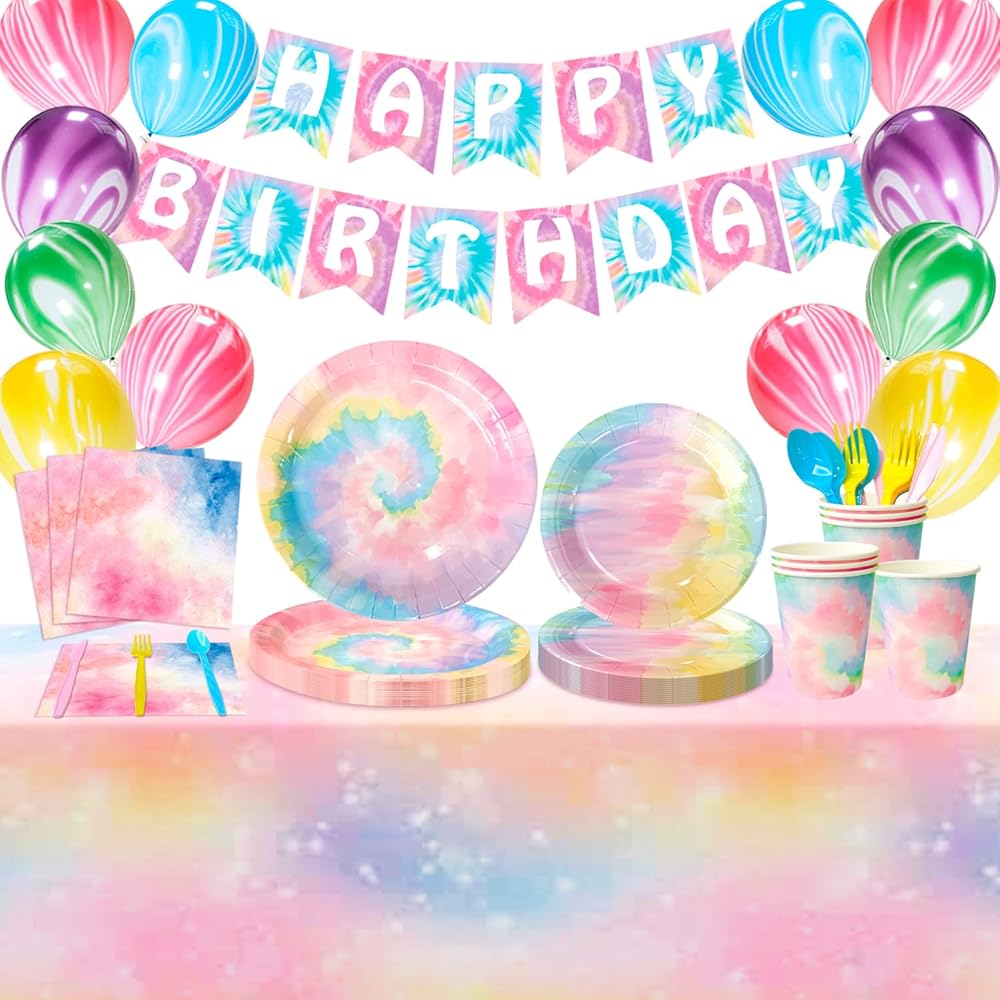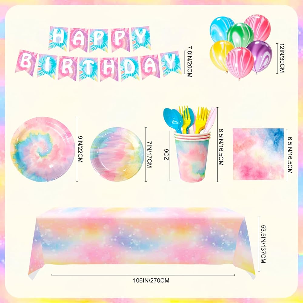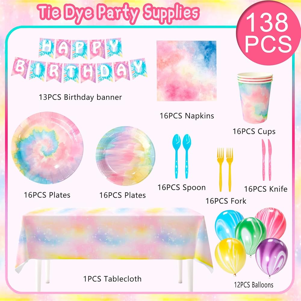 • 🍥Tie Dye Party Supplies🍥 his tie dye birthday supplies includes 1 tie dye happy birthday banner,1 tie dye table cloths for parties,12 tie dye party ballons,16 tie dye napkins,16 tie dye cups,16 9" tie dye paper plates,16 7" tie dye party plates and many more tie dye party tableware.