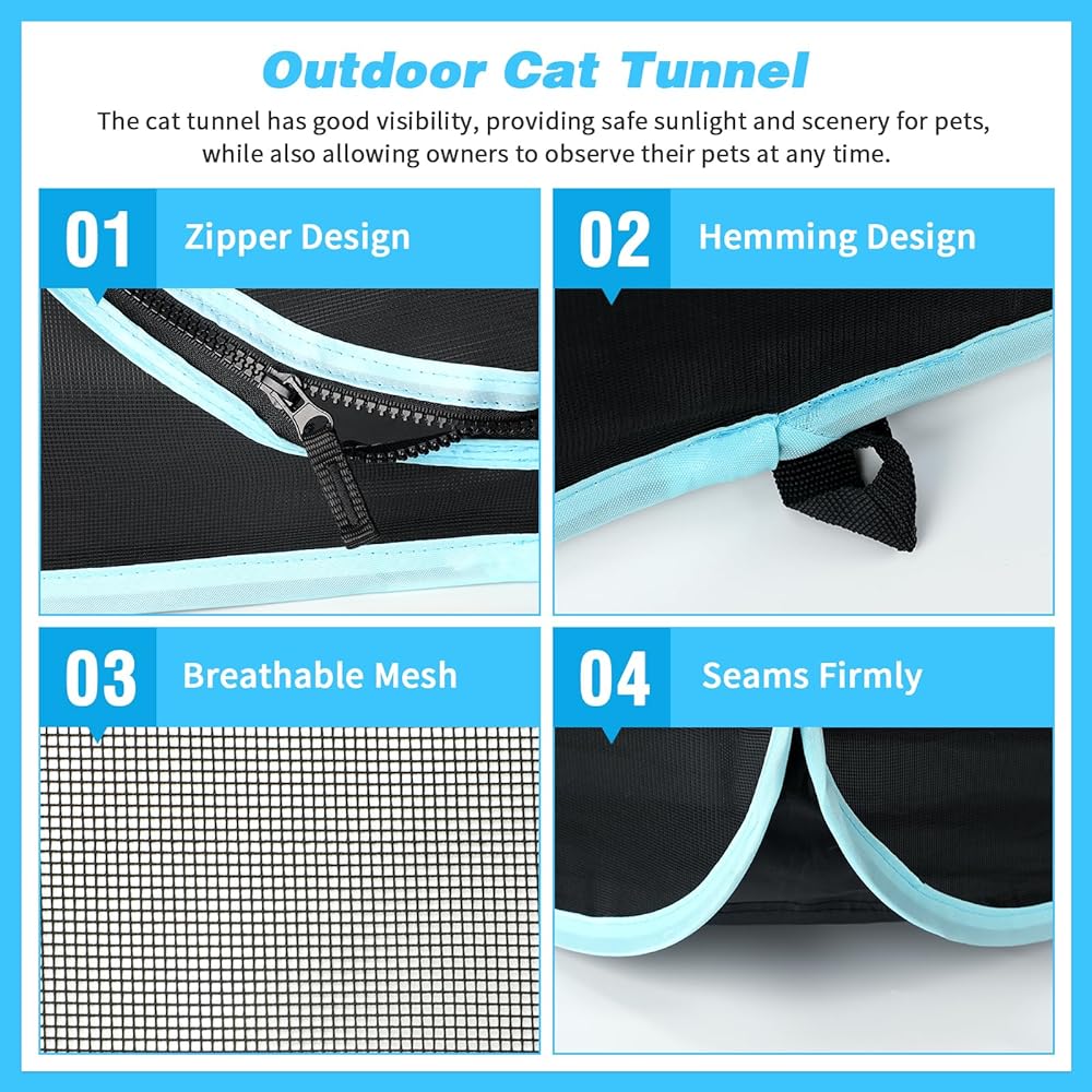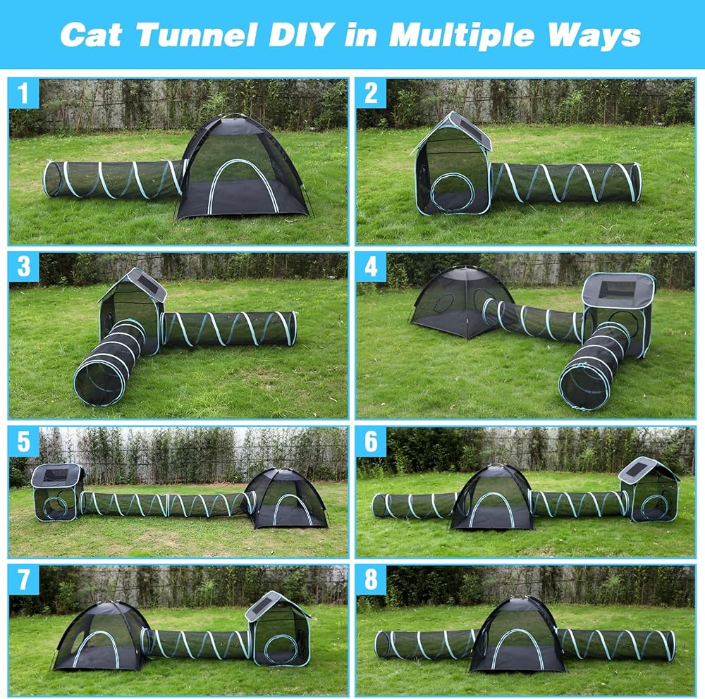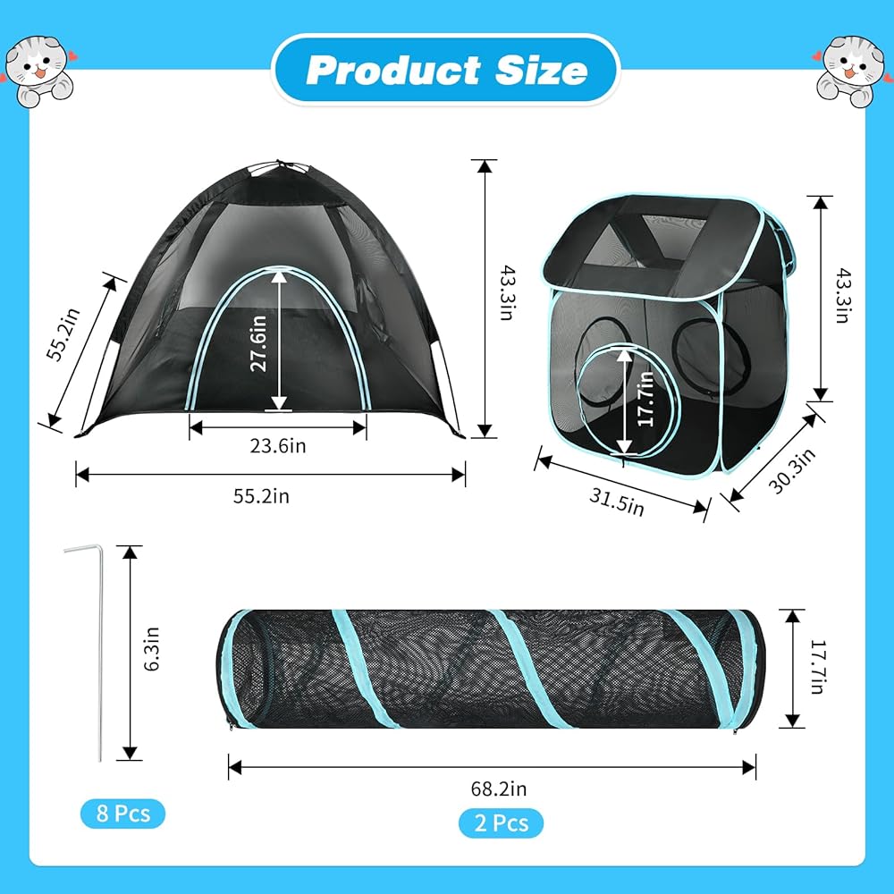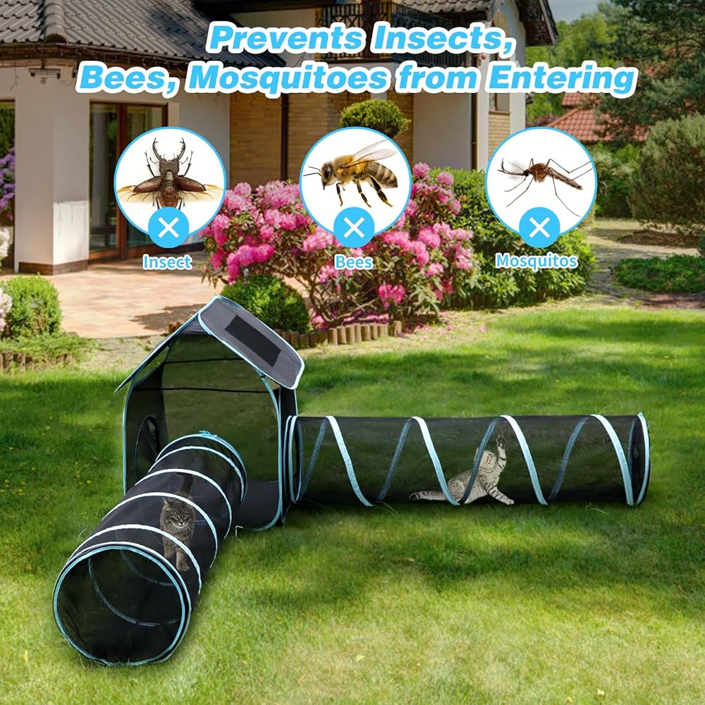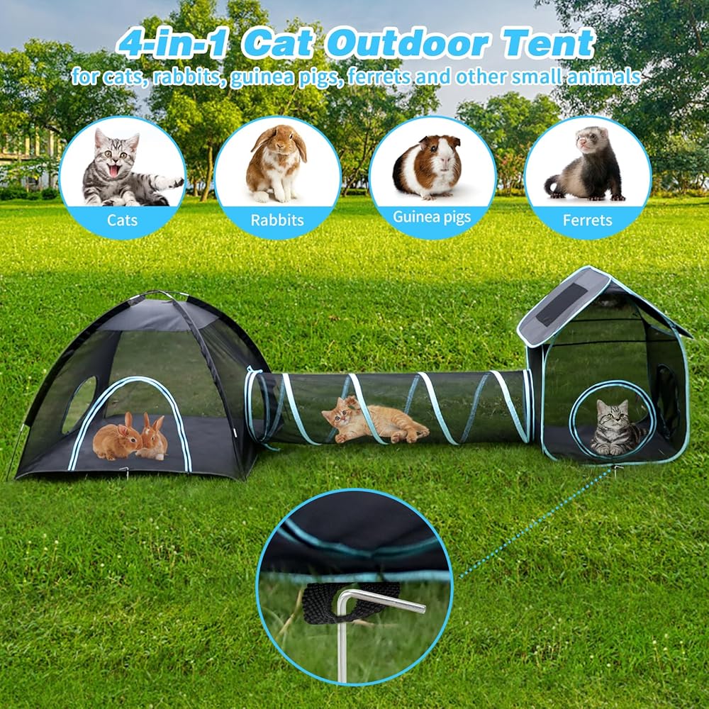 🐱 نفق للقطط في الهواء الطلق - تم تصميم خيمتنا الخارجية للقطط 4 في 1 لتوفر لأصدقائك القطط بيت لعب خارجي آمن ومريح حيث يمكنهم الاسترخاء والاستمتاع بالقرب من الطبيعة! تضمن المادة الشبكية عالية الجودة التهوية والرؤية المناسبة، مما يجعلها مثالية للأسر التي تحتوي على العديد من القطط ويمكن استخدامها في الداخل والحدائق والمتنزهات.