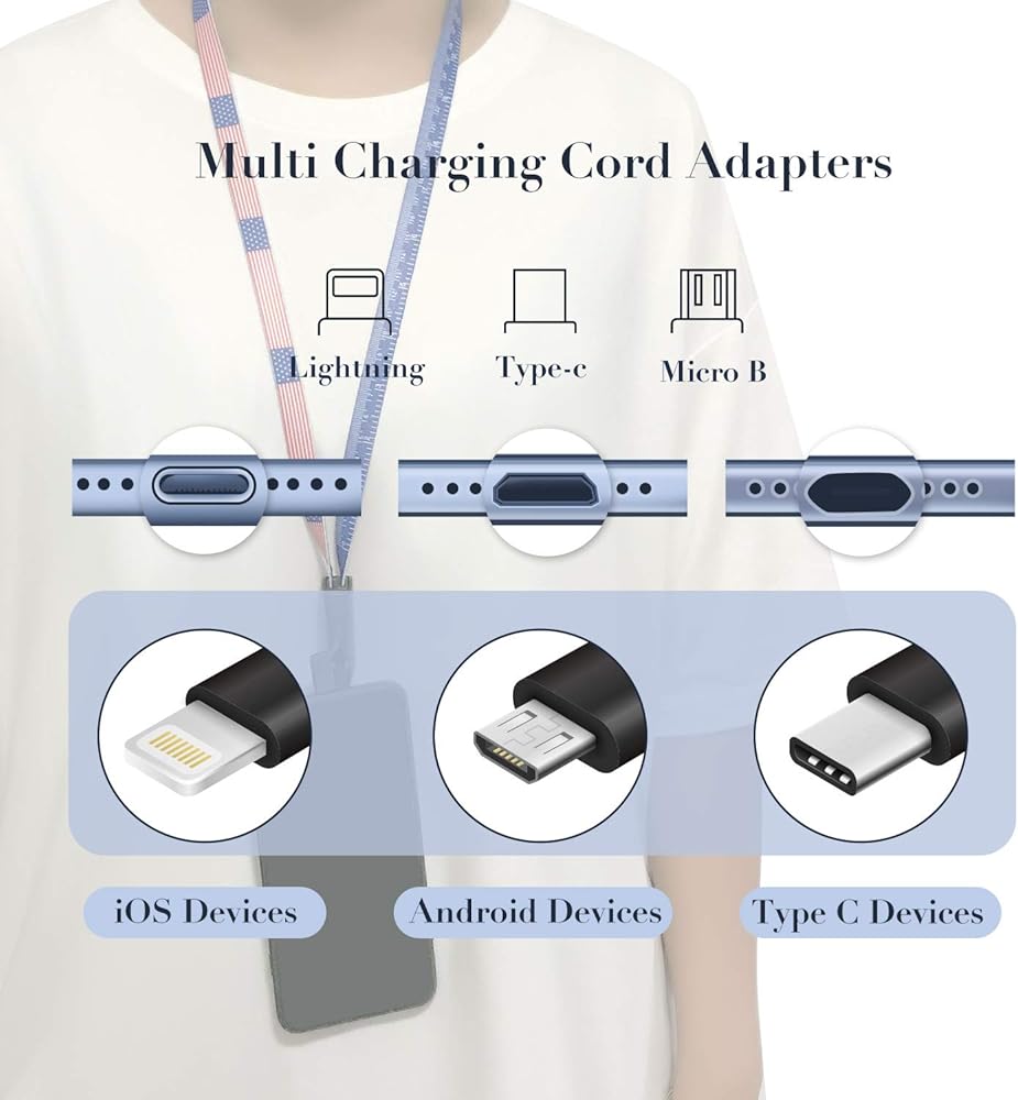 【Charge Cable】 The cable is designed as hanging neck strap with snap fastener on each end to lock. According to the plug type and adapter, it could be used to charge iPhone or Android device like Samsung, LG, Motorola and Pixel etc.