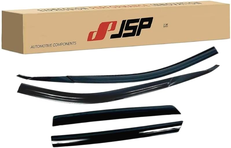 "Car window rain guards are one must-have accessory that upgrades your vehicle, offering fresh air circulation while keeping the rain out. With its streamlined appearance, JSP exterior window mount tape-on wind deflectors thus maintain freshness in the air by letting odor out from the smoke, pets, sports gear, and food. While on a hot summer day, it allows keeping the windows open about an inch in a parked position to ventilate built-up heat and humidity. The dark-tinted smoke surface of these window deflectors hides the clearance ensuring the privacy and security of your belongings. Let's face reality - quality is hard to find these days. JSP provides high-quality manufacturing with a contoured design for improved aerodynamics, whether a rain guard, rain deflector, window strip, or you name it. Each piece features a custom low-profile, sleek look that will blend with your vehicle with a seamless look and subtle style. The professional-grade, not-to-thin, but not-to-thick impact-resistance acrylic withstand the carwash, storm, sleet, and snowy weather. The easy DIY installation is a breeze with our provided video tutorial and step-by-step installation instruction. Best of all, JSP car rain guards are backed by a one-year manufacturer's warranty."