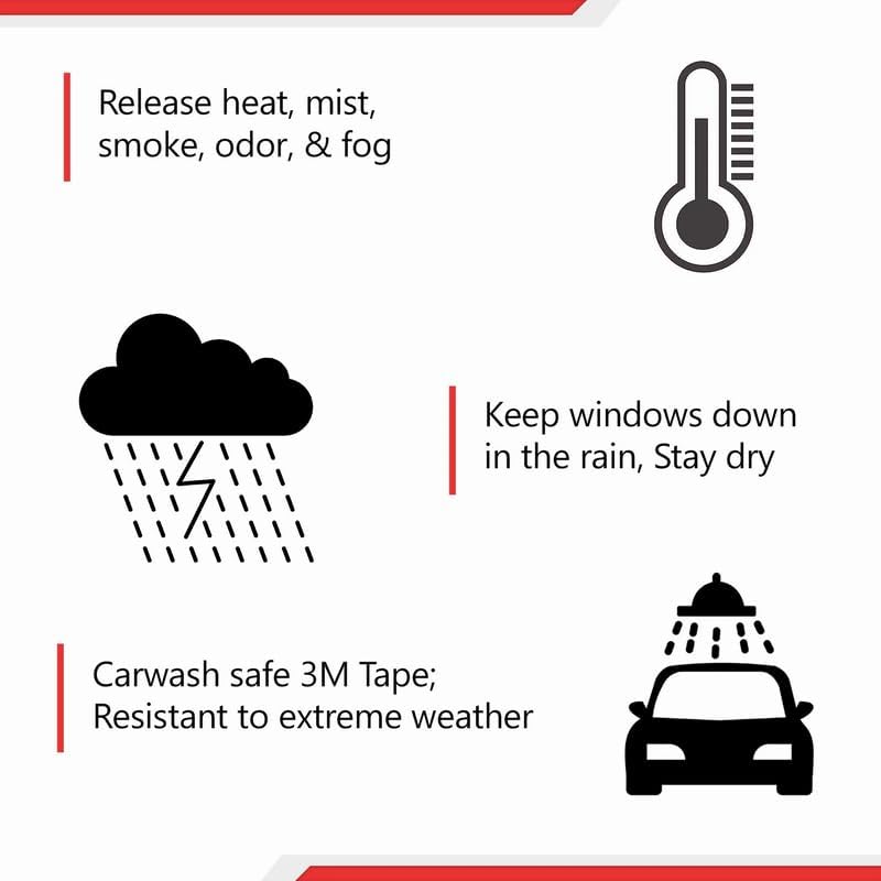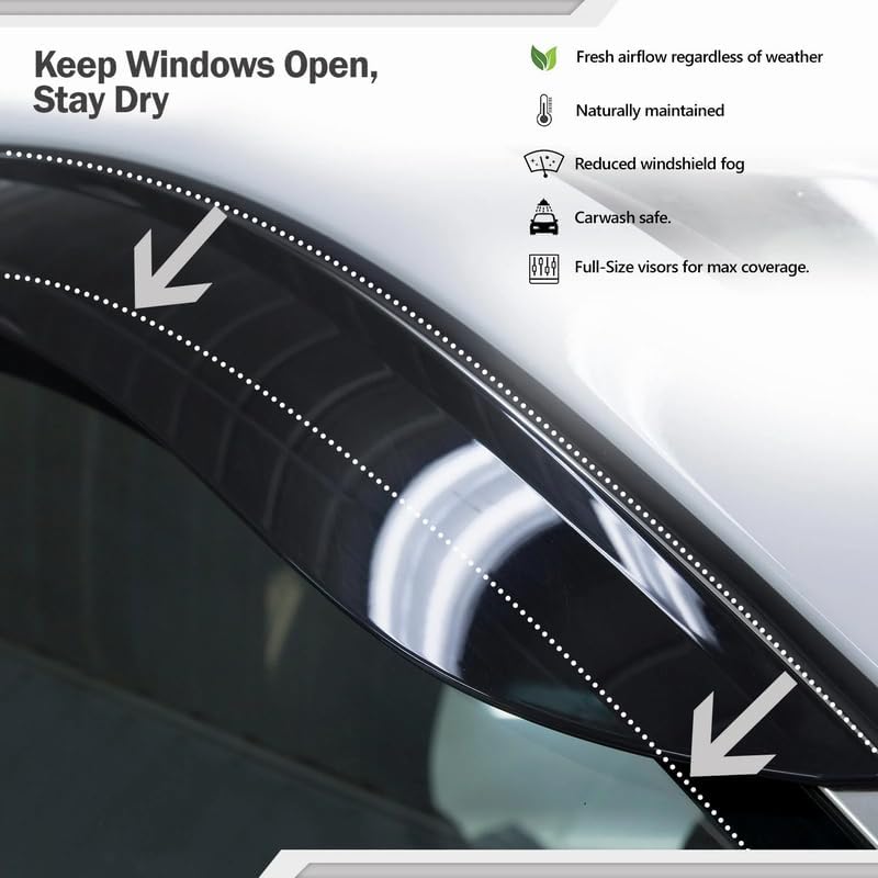 Keep window down, rain away, ventilate mist, odor, smoke, humidity, and circulate fresh air: effortlessly ensure a comfortable ride for everyone. Car window rain guard keeps inside from rainwater, blocks UV, removes odor from pets, smoking, food crumb, sports gear, and reduces wind noise.