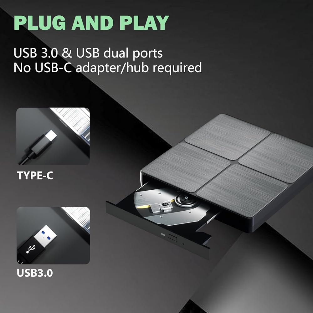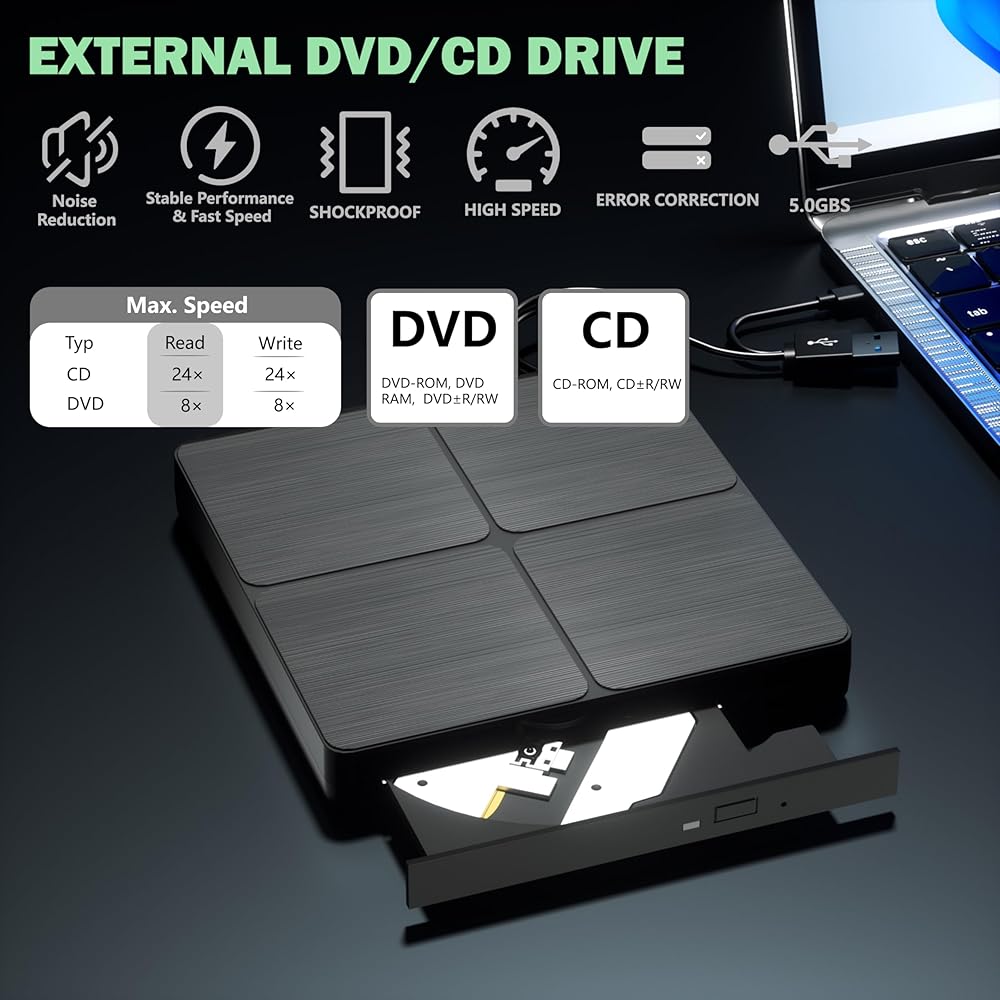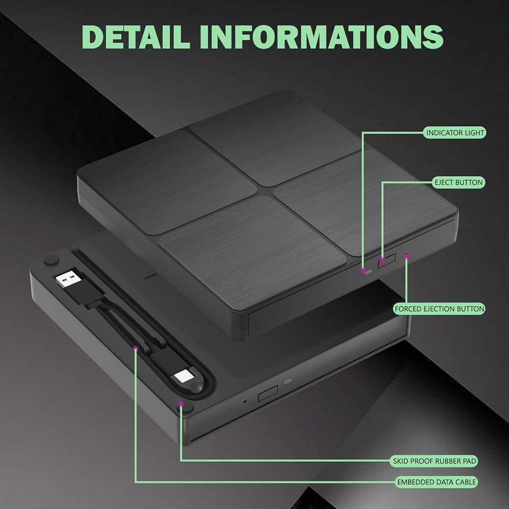 • 🔵【أحدث تقنيات USB 3.0】استمتع بنقل بيانات أسرع وأداء أكثر استقرارًا مع تقنية USB 3.0 المتقدمة. متوافق أيضًا مع USB 2.0، وهو مثالي لتسجيل الموسيقى ومقاطع الفيديو وتثبيت البرامج أو إنشاء نسخ احتياطية للأقراص المضغوطة/أقراص DVD.