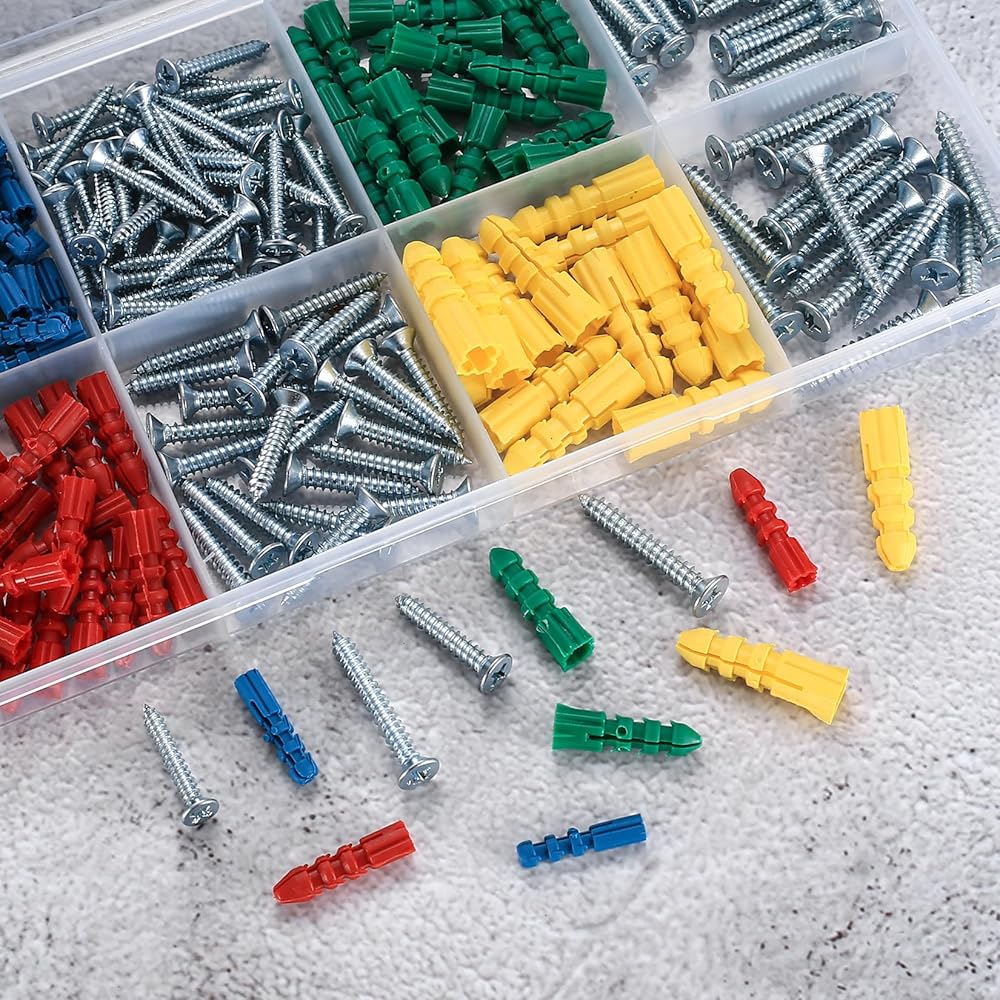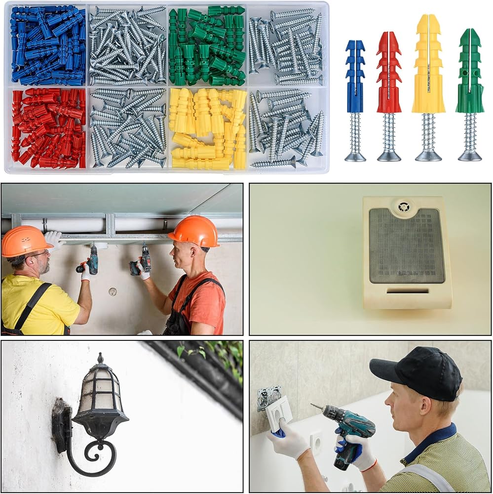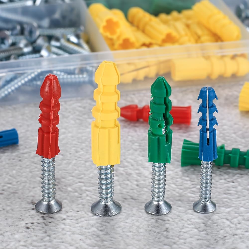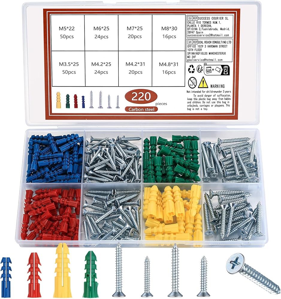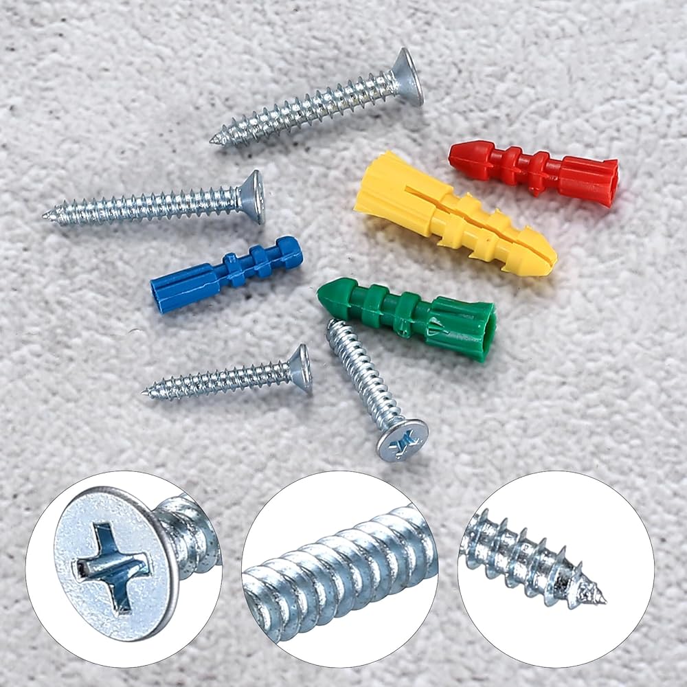 طقم مثبتات ومسامير للجدران الجافة، 220 قطعة من مثبتات الحائط ومسامير للجدران الجافة، مثبتات حائط مضلعة بلاستيكية مع مسامير ذاتية التنصت، براغي ذات رأس مسطح لتعليق صور الحائط الجاف الخرساني