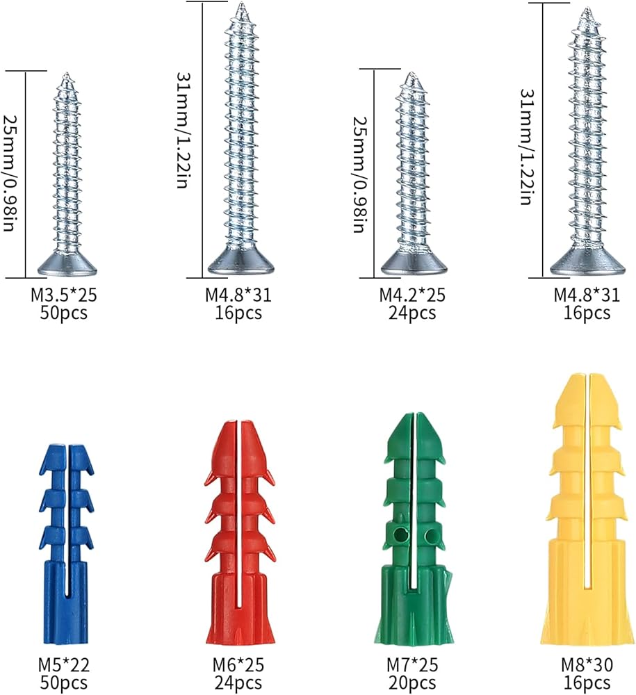 تشمل العبوة: 220 قطعة إجمالاً، بما في ذلك 110 قطعة برغي في مثبتات الحوائط الجافة: 50 قطعة m5x22، 24 قطعة m6x25، 20 قطعة m7x25، 16 قطعة m8x30؛ 110 قطعة براغي مسطحة الرأس: 16 قطعة مقاس 4.8 × 31 مم، 20 قطعة مقاس 4.8 × 31 مم. 2 × 31 مم، 24 قطعة م 4.2 × 25 مم، 50 قطعة م 3.5 × 25 مم. غنية بالحجم والكمية، لتلبية احتياجاتك في مختلف المناسبات والمجالات.