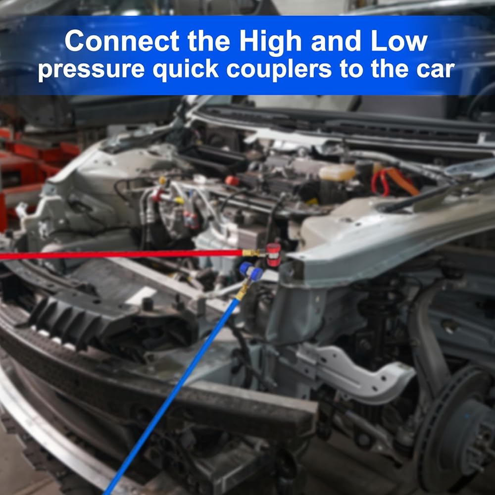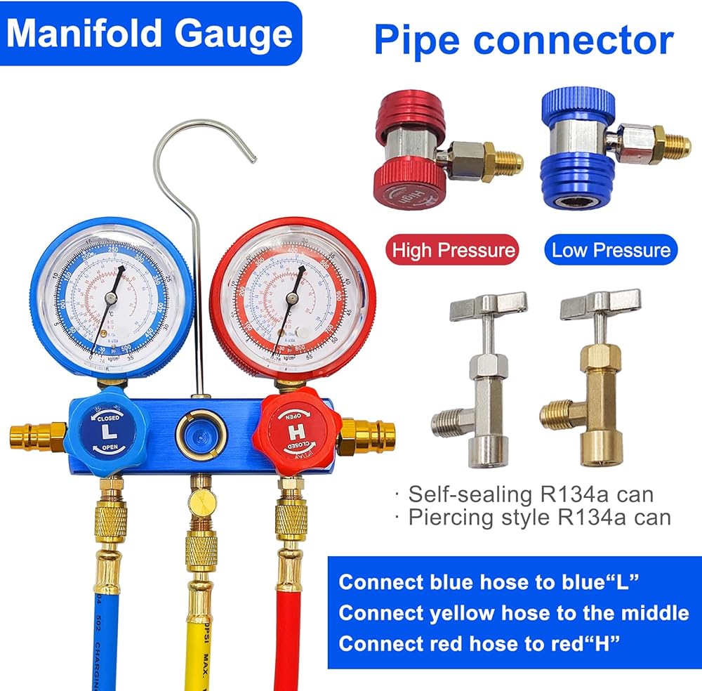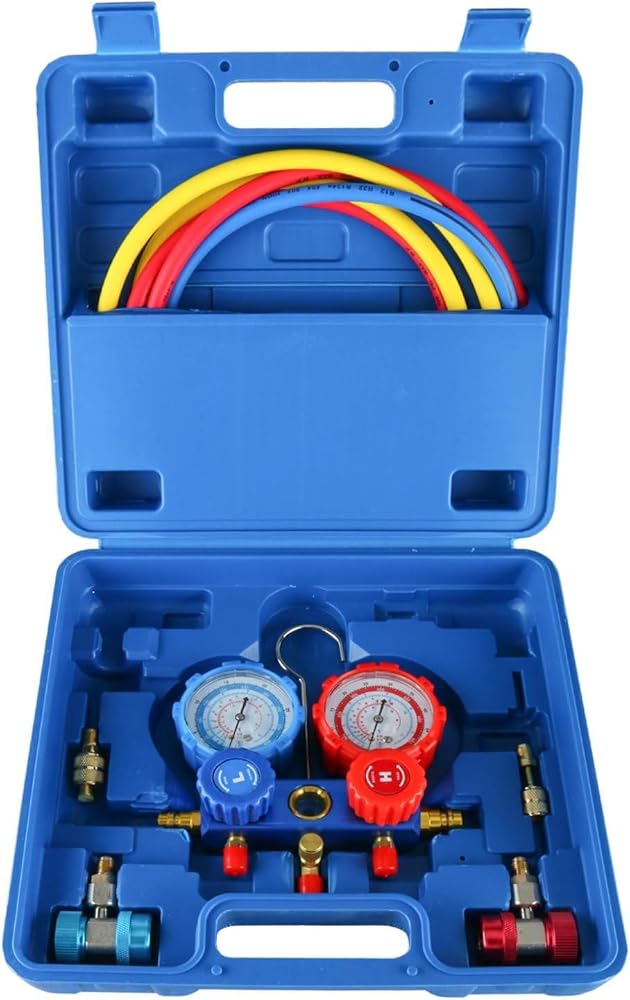 3 خراطيم مرمزة بالألوان تساعد على تحديد جانب الضغط العالي (أحمر)، وجانب الضغط المنخفض (أزرق)، وخرطوم التعبئة (أصفر)، للحفاظ على أنظمة تكييف الهواء R134a، R12، R22، R410a؛ نحن مجهزون بمحولات تركيب R410a مقاس 1/4 بوصة SAE ذكر إلى أنثى مقاس 5/16 بوصة SAE.