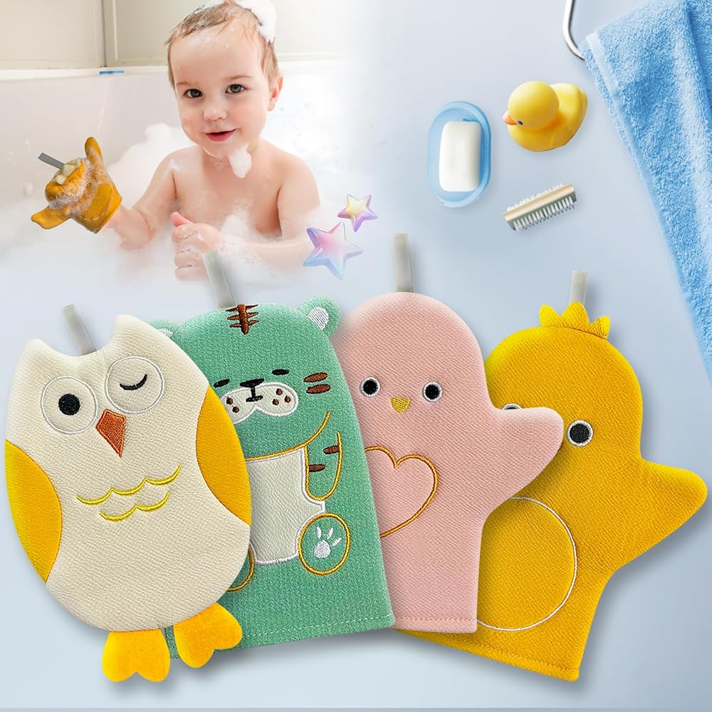 【Funny and Cute Baby Bath Sponge】: You will receive 4 different styles of baby wash cloths including blue tiger, colorful owl, yellow duckling and pink chick, enough for daily use and replacement, cute and sweet shapes are popular among most families