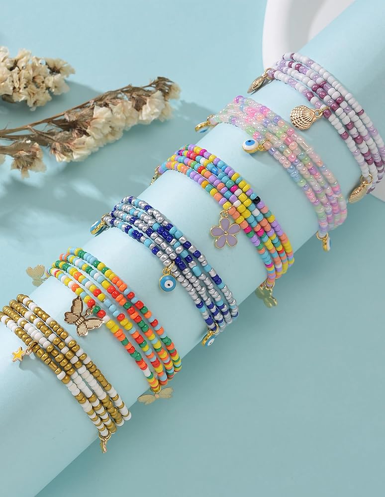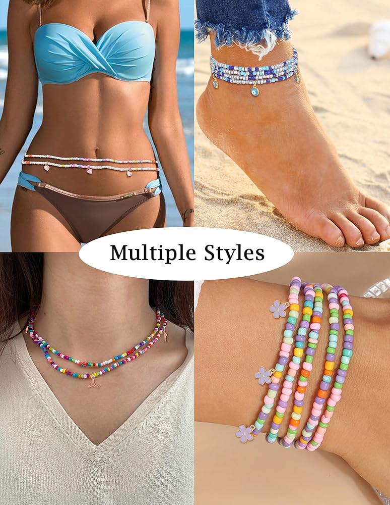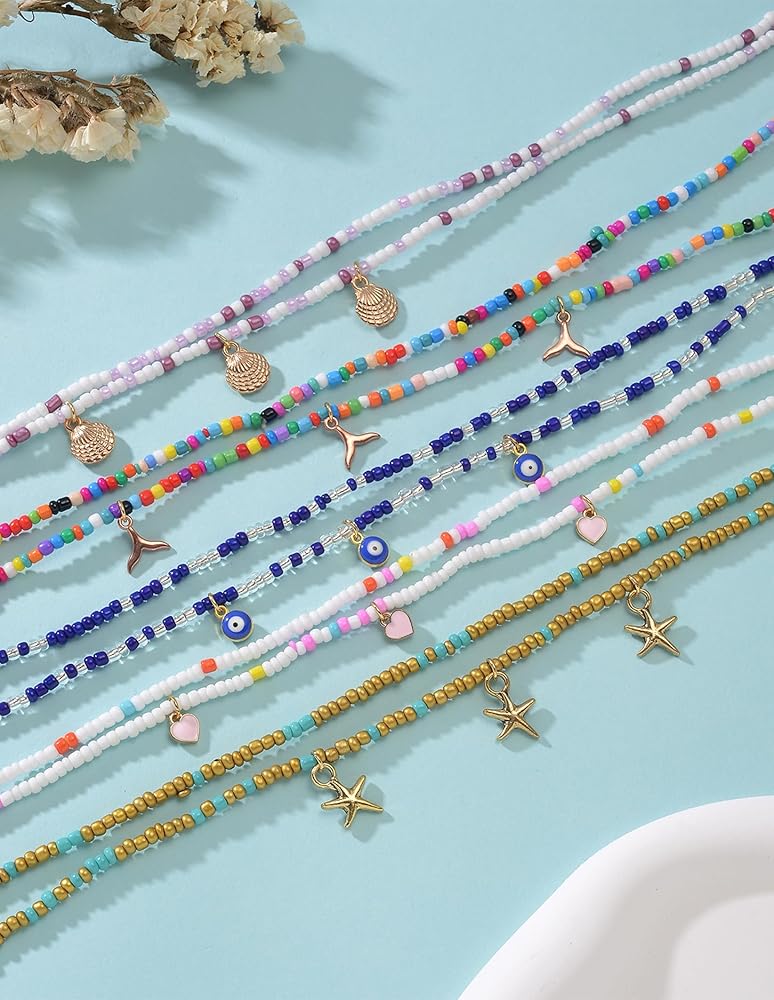 [سلاسل خرز الخصر] طلب واحد سوف تحصل على 10 قطع من القلادات المختلفة، بما في ذلك النجمة والفراشة والعين الشريرة الزرقاء والقلب والزهرة وذيل السمكة والصدفة وما إلى ذلك، سلاسل خرز الخصر الملونة تجعلك أكثر جاذبية في الصيف