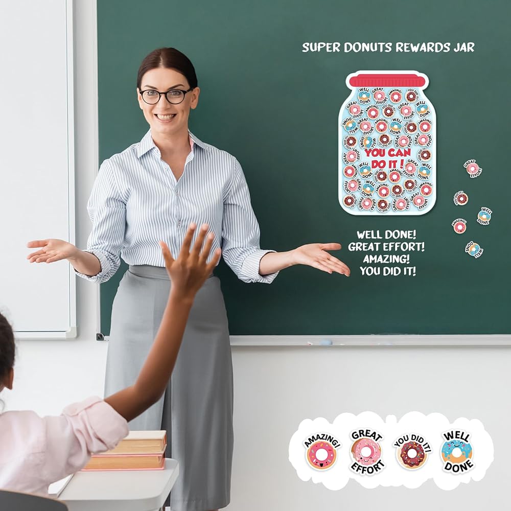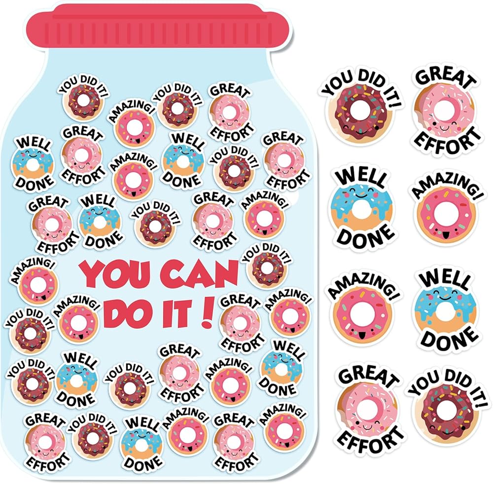 • Motivational Tool for Positive Reinforcement: the donut teacher reward jar magnet is not only a fun and attractive decoration but also a compelling instrument of positive reinforcement; It aids teachers and families to encourage children to develop good habits and achieve set tasks; By rewarding their progress with donut magnets labeled with words of encouragement, children become more motivated, making the reward jar an effective motivational tool