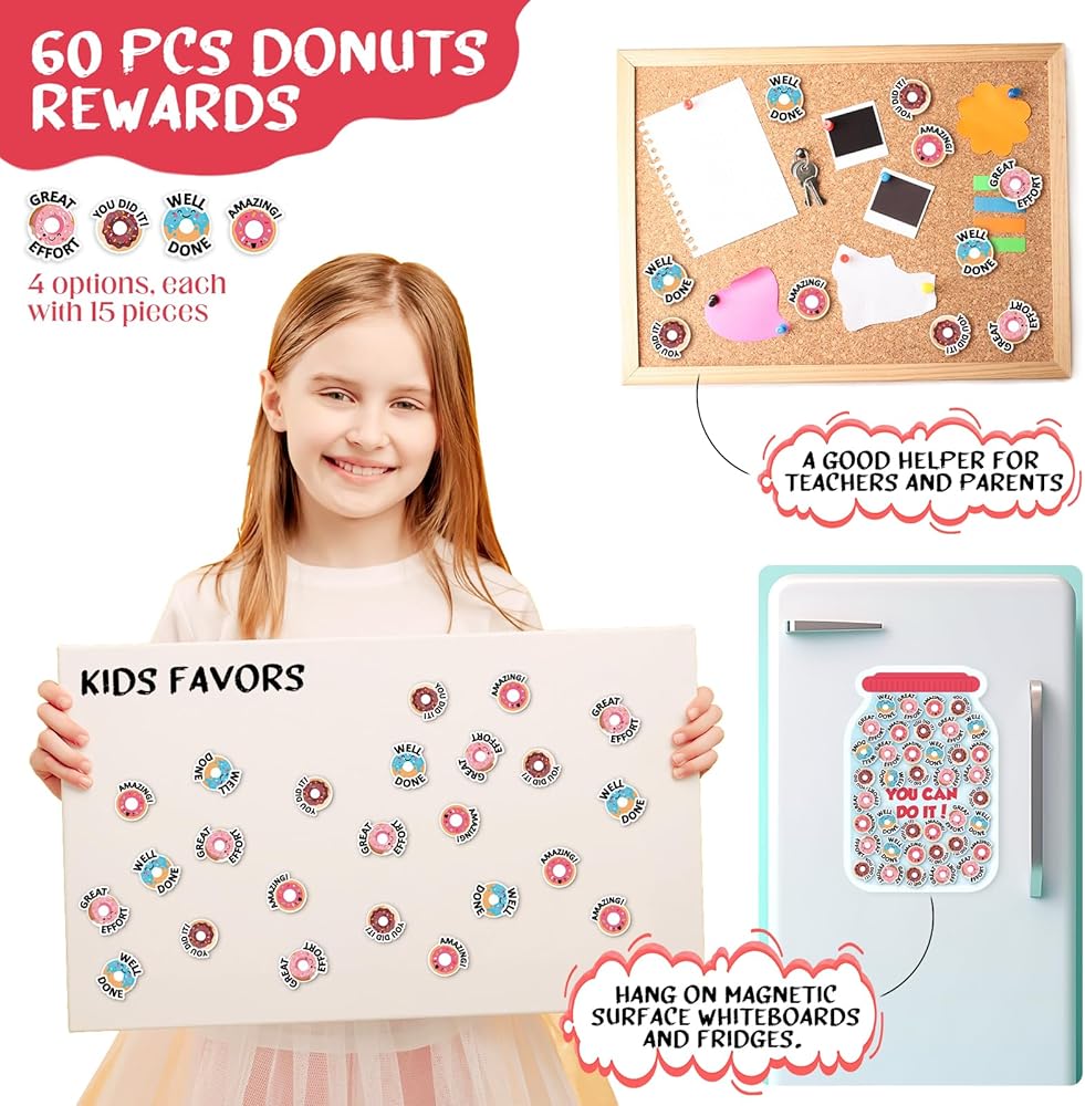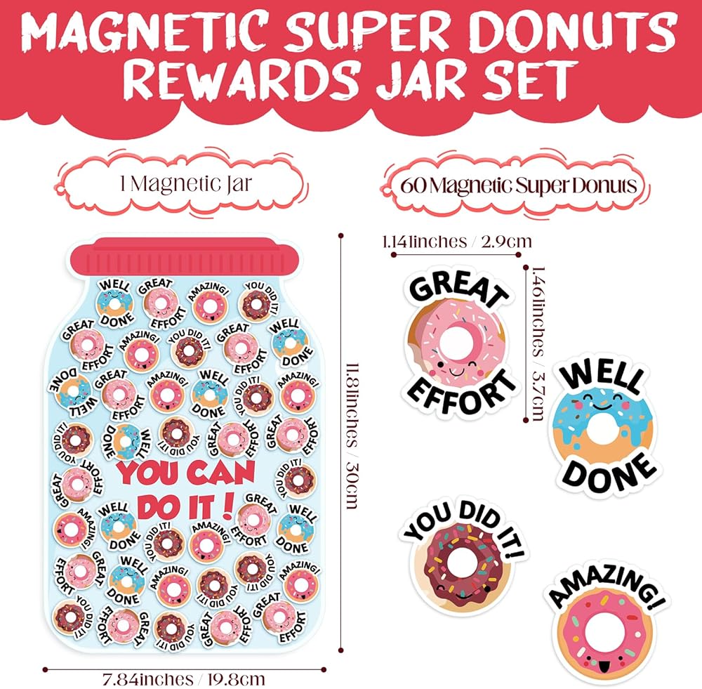 • Impressive Packaging: the delightful package includes 60 donut magnets for children and 1 classroom reward jar magnet; This careful selection ensures a sustainable reward system that can keep up with your child or student's progress and milestones