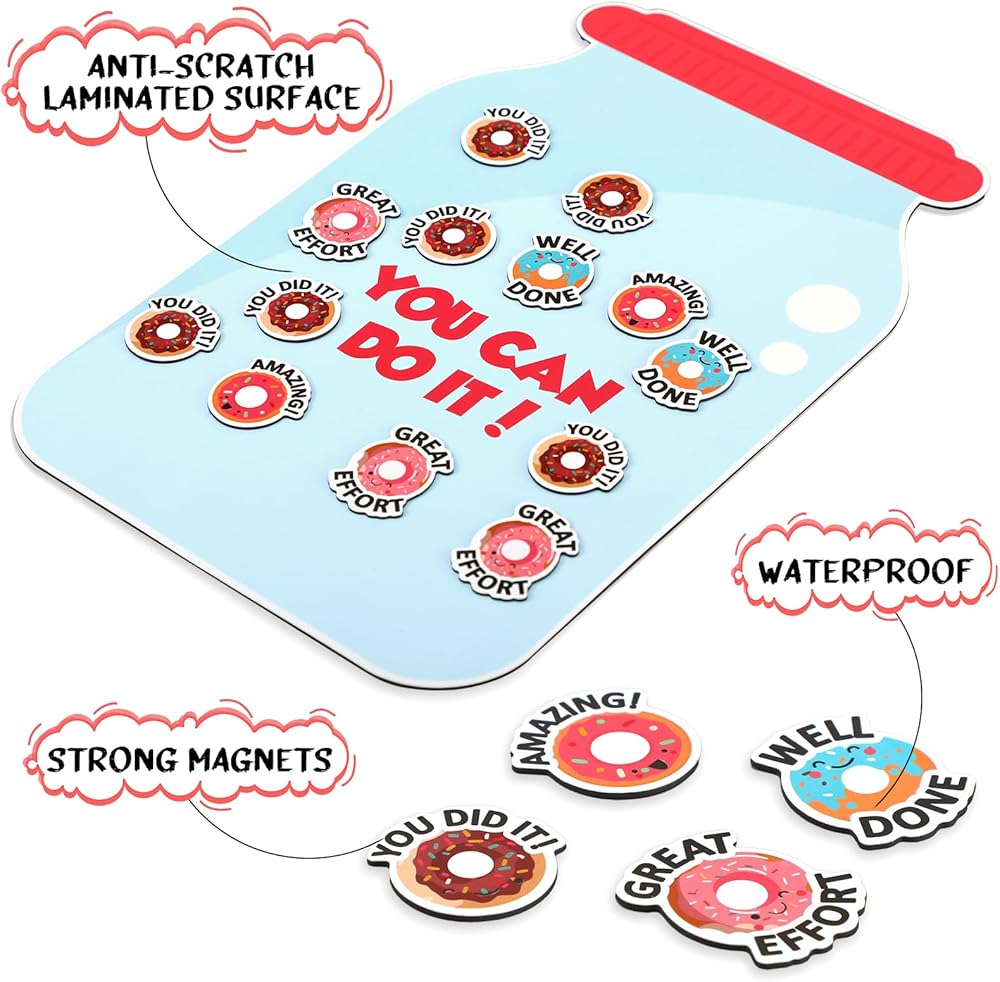 • Multifunctional Educational Accessory: the donut positive behavior chart magnet serves as an exciting way to motivate children to do chores, finishing homework, etc.; It's an inclusive way for teachers and parents to support and appreciate children's effort, making learning and responsibility management a more enjoyable activity