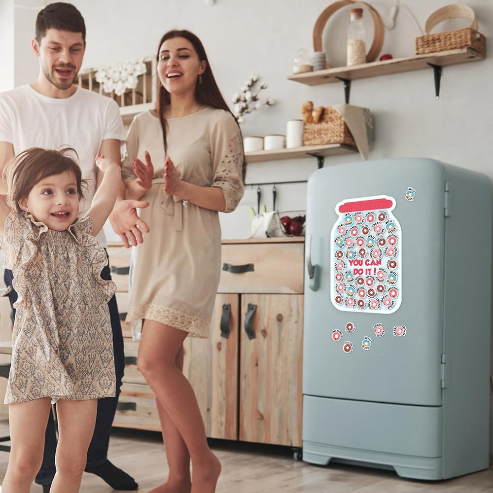• Suitable Size for Any Magnetic Surface: with the reward jar magnet's dimensions of about 11.81 x 7.8 x 0.04 inches, and the donut magnet measuring about 1.46 x 1.14 x 0.04 inches, they are sized to fit on any magnetic surface; This adaptable size aids in the convenient positioning of this motivational tool wherever it may be needed