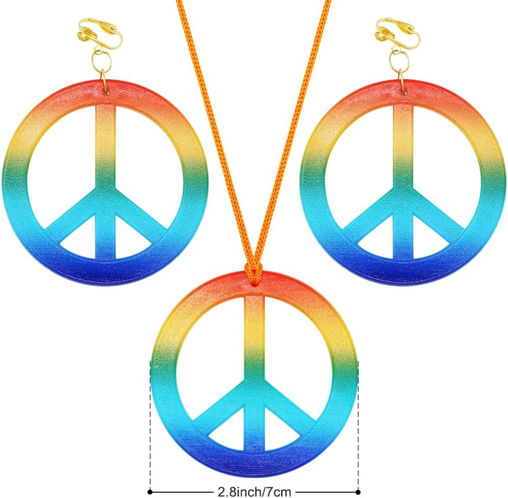قلادة هيبي قوس قزح: تتميز قلادة علامة السلام بنمط دائري ملون لعلامة السلام (قطر 2.75 بوصة/ 7 سم تقريبًا) مع حبل برتقالي جميل، قلادات علامة السلام هذه من الستينيات والسبعينيات تمثل أزياء جميلة للفتيات والأولاد الذين يرتدون ملابس هيبي