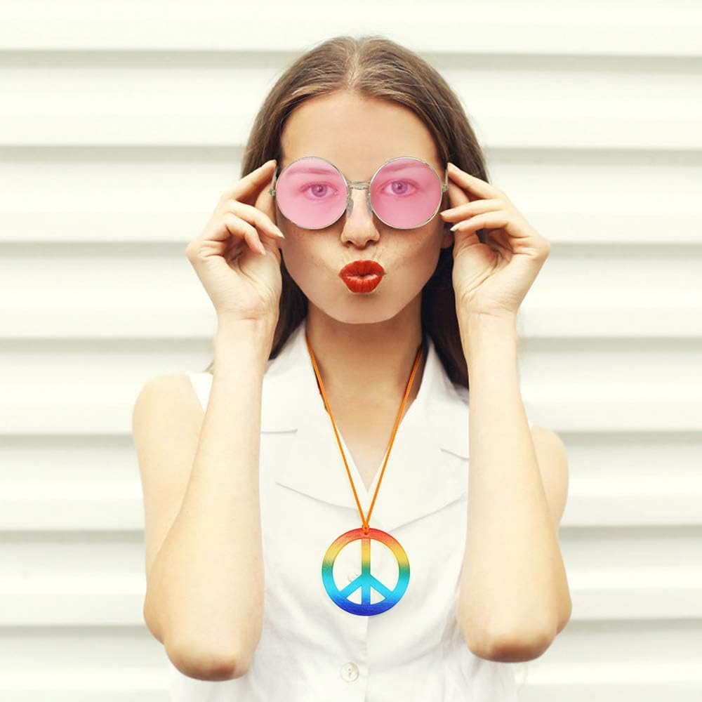 مجموعة أزياء هيبي المكونة من 4 قطع من إكس بلانيت، إكسسوارات حفلات هيبي من الستينيات والسبعينيات للنساء والرجال، تتضمن قلادة علامة السلام بألوان قوس قزح، وعصابة رأس على شكل تاج زهرة، وأقراط علامة السلام ونظارات شمسية هيبي