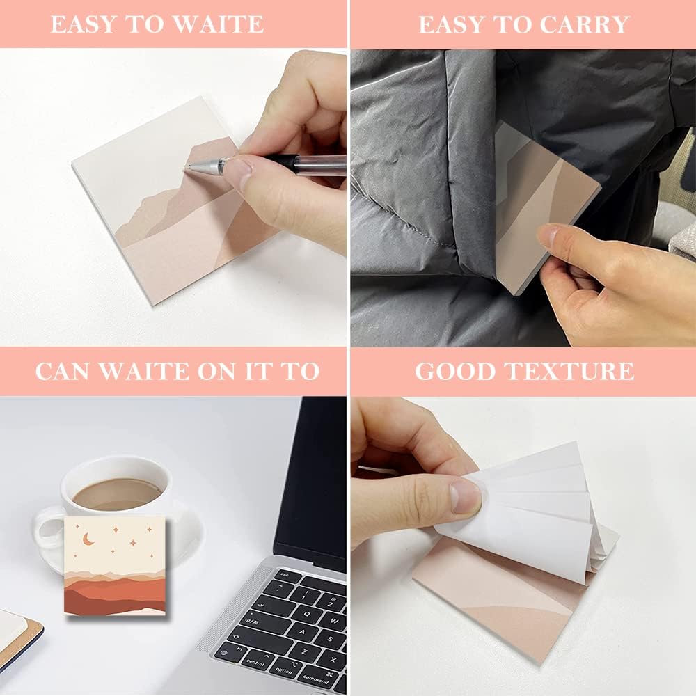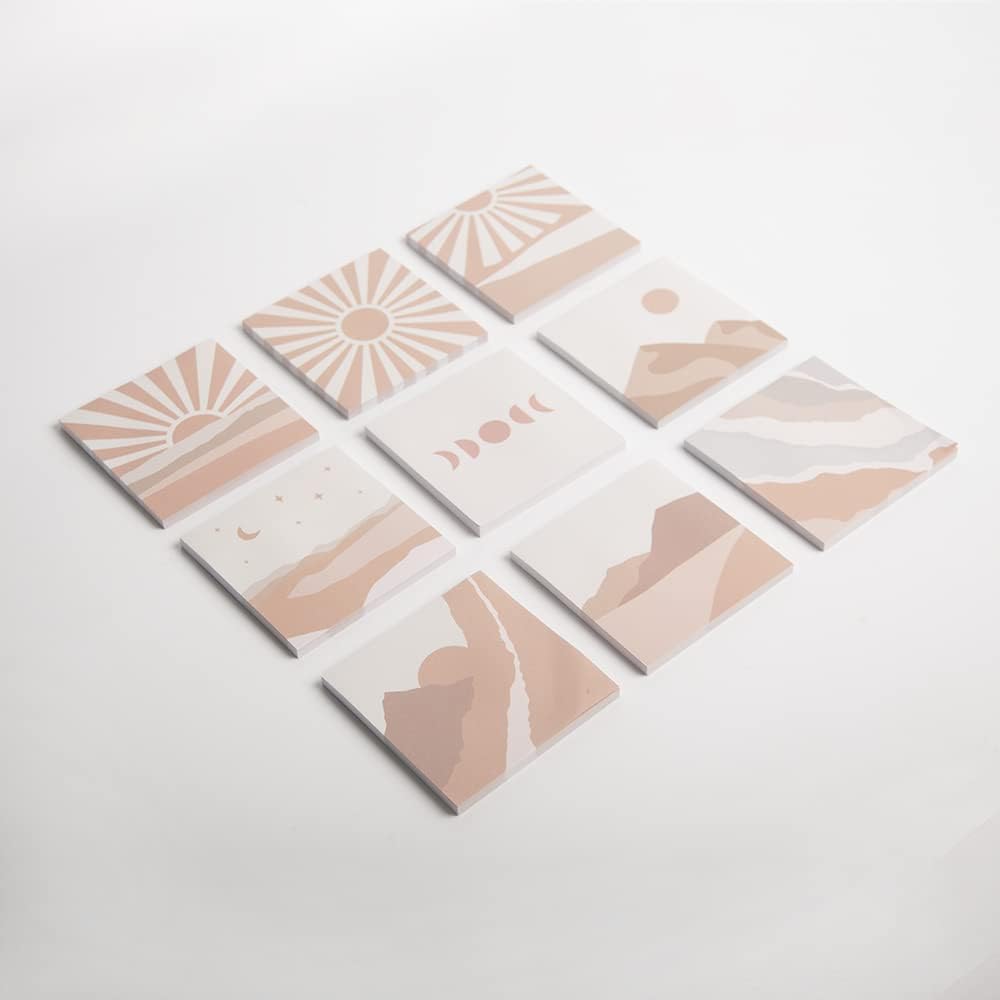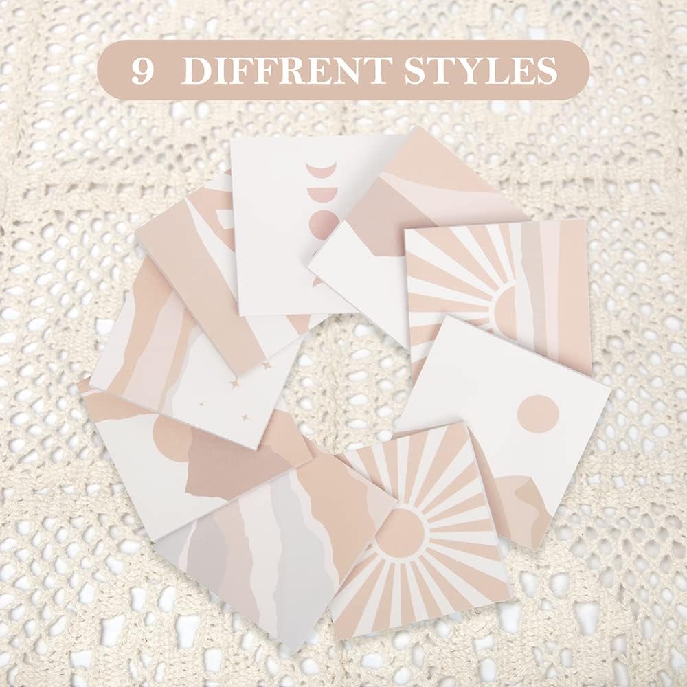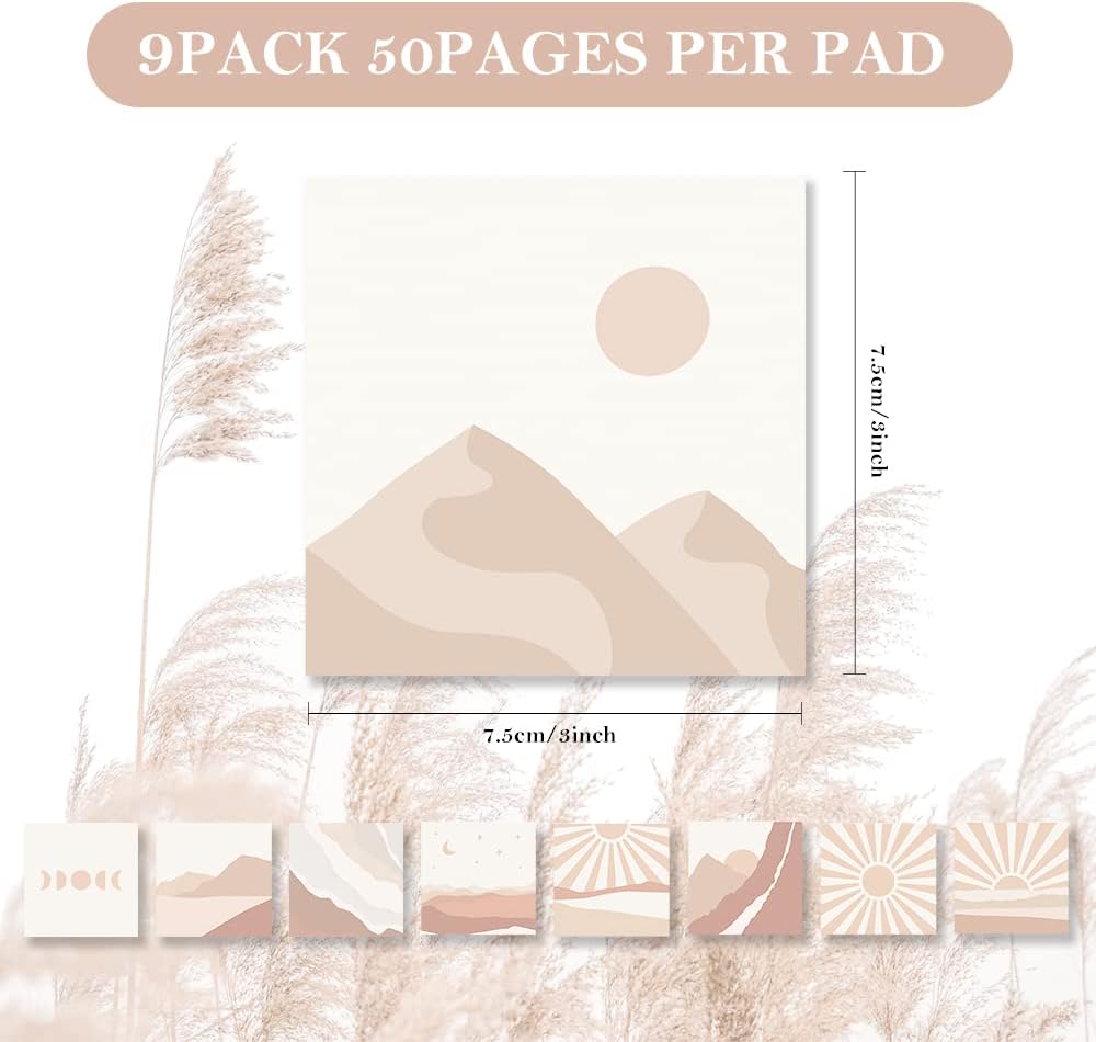 Product Size: 3 x 3 inches Package Included: 9 pack, 50 sheets/Pad, Total 450 sheets Color: 9 different antique looking color and pattern The advantage of our vintage sticky notes : √Thick paper √No ink-seepage √Smooth writing √unique pattern√old school style