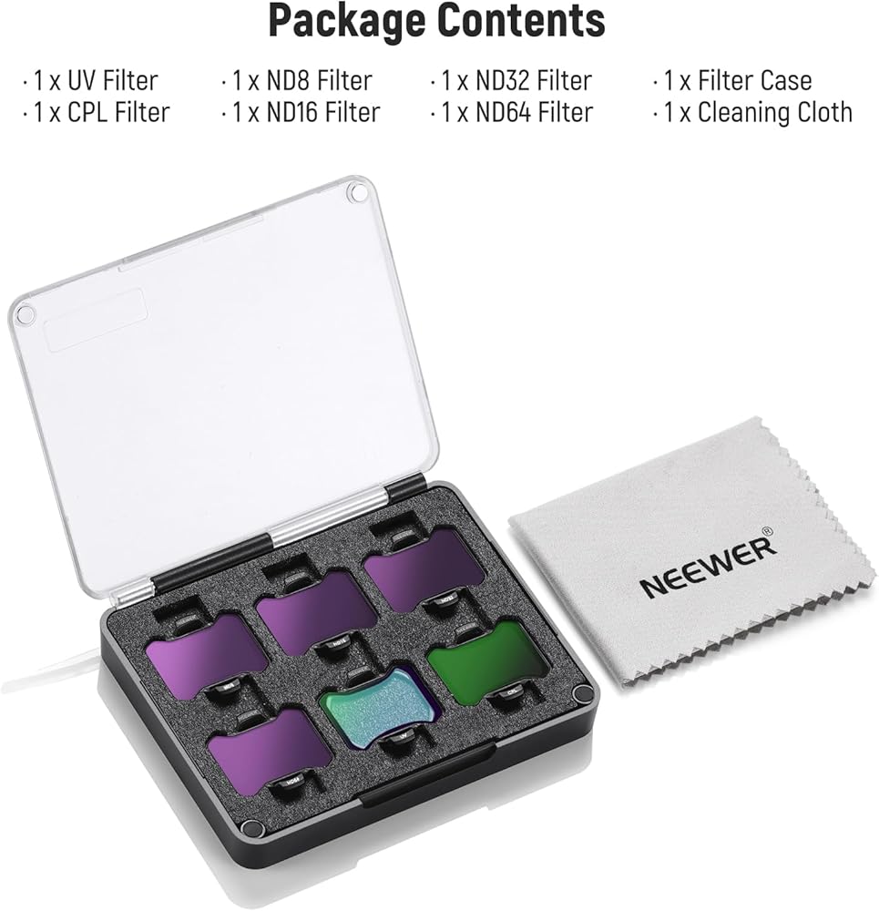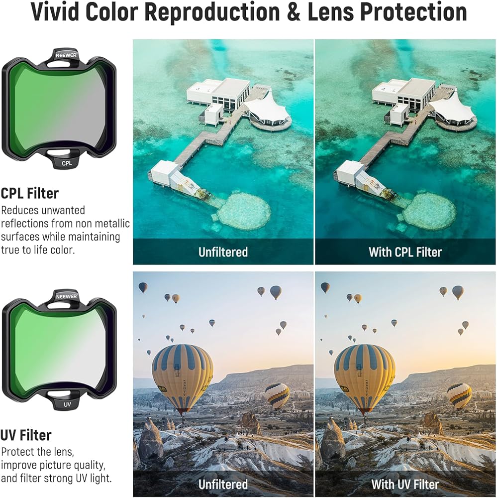 【Fully Compatible with Avata 2】 NEEWER ND&UV&CPL Filter Set compatible with DJI Avata 2 includes ND8 ND16 ND32 ND64 filters, CPL filter, and UV filter, enabling you to precisely control the aperture and shutter speed, protecting your lens from dust and scratches, and presenting true to life color reproduction. Mount these filters on your drone's lens, improve exposure control in varying weather conditions to deliver magic and thrilling drone shots with natural colors