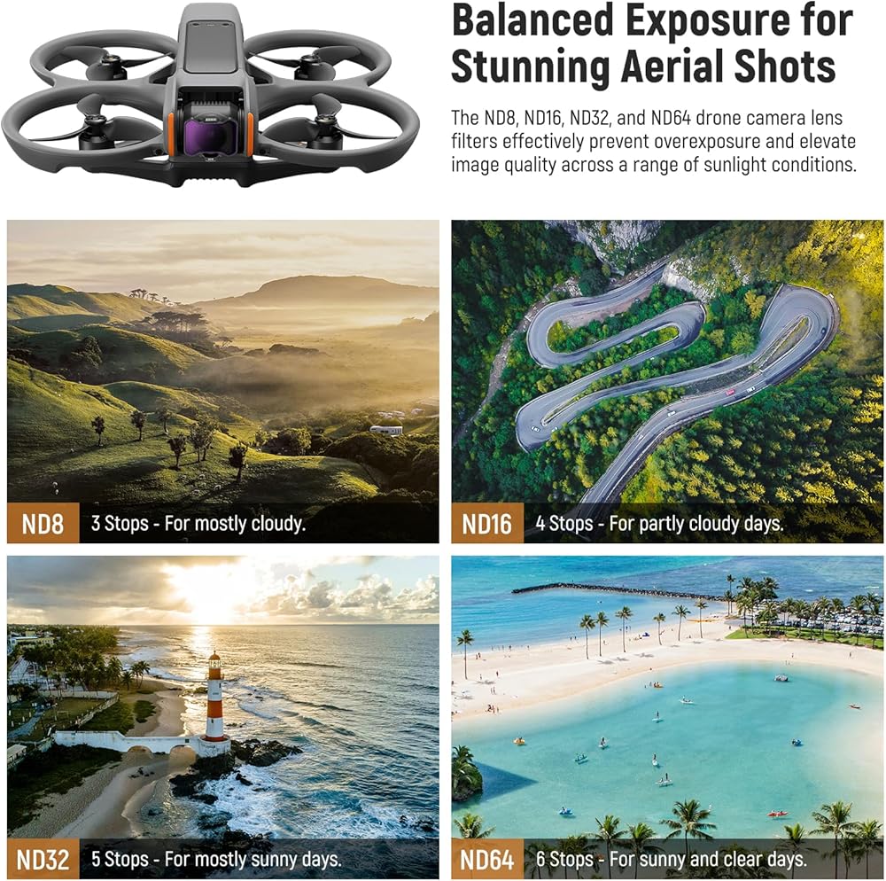 【Balanced Exposure for Stunning Aerial Shots】 The ND8, ND16, ND32, and ND64 drone camera lens filters offer precise exposure control during dynamic outdoor activities, with light reduction options of 3, 4, 5, and 6 stops, respectively. They effectively prevent overexposure and elevate image quality across a range of sunlight conditions, contributing to capturing stunning motion blur for epic footage on every flight
