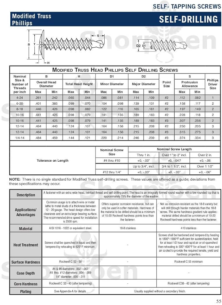 Not as corrosion-resistant as the 18-8 variety but will drill through harder materials than the 18-8 screw. The same hardness gradient rule applies: material drilled should be a minimum of 10-20 Rockwell hardness points less than the fastener. 410 stainless