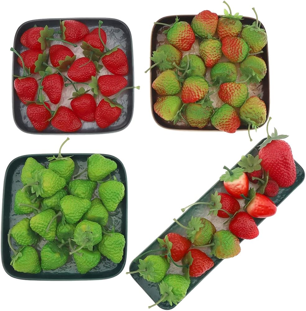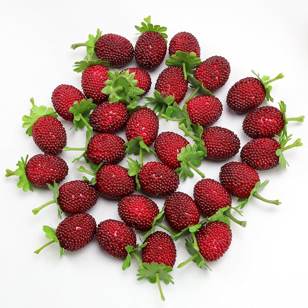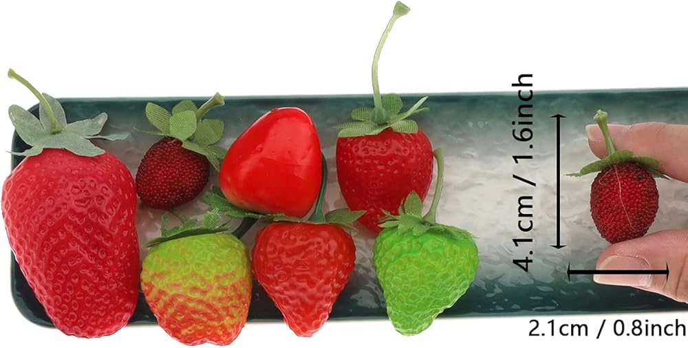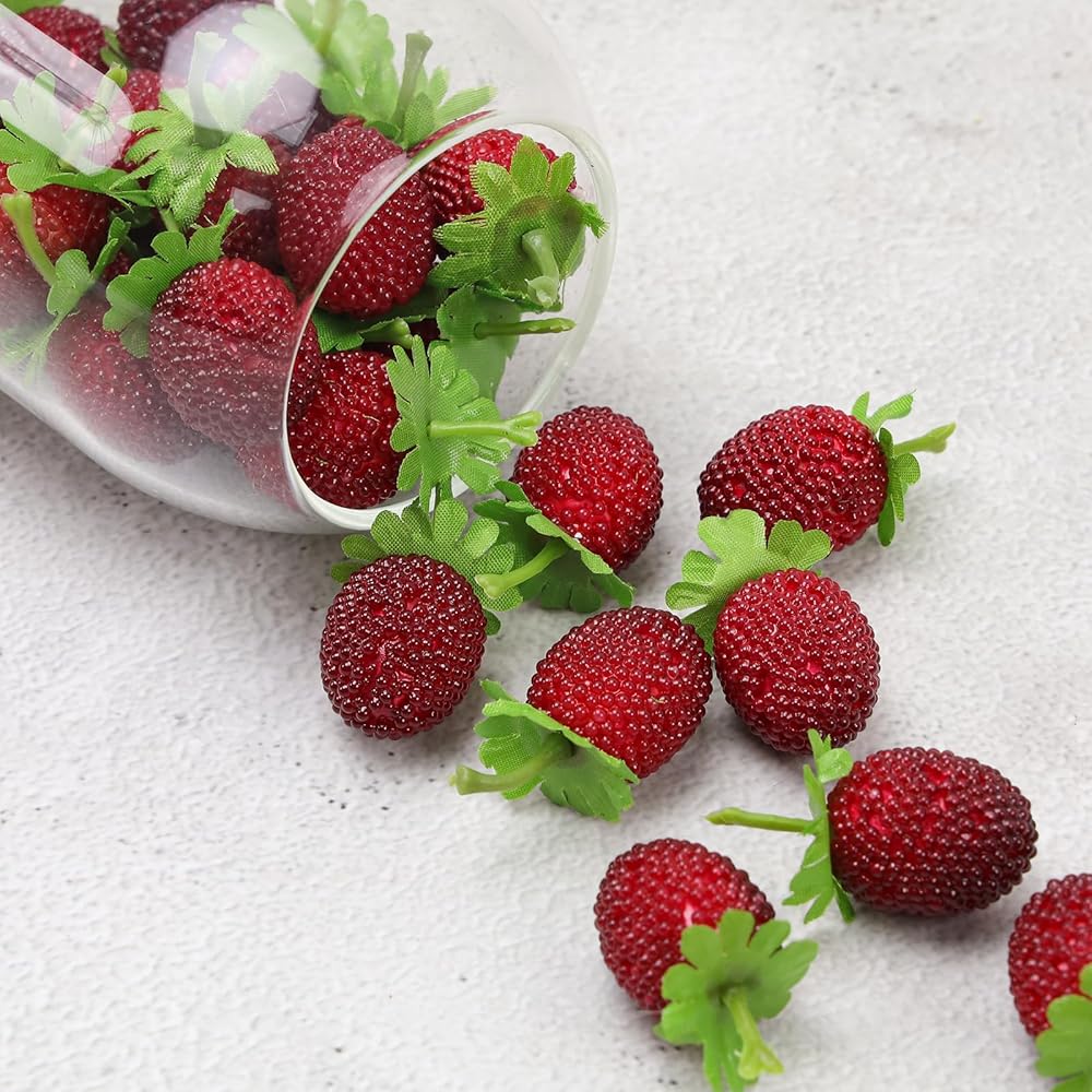 Our artificial strawberries are great for fruit displays, wine decor, home decor, kitchen decor,plastic fake artificial strawberriesare very good game props and can also be used for DIY various hair clip and head rope.